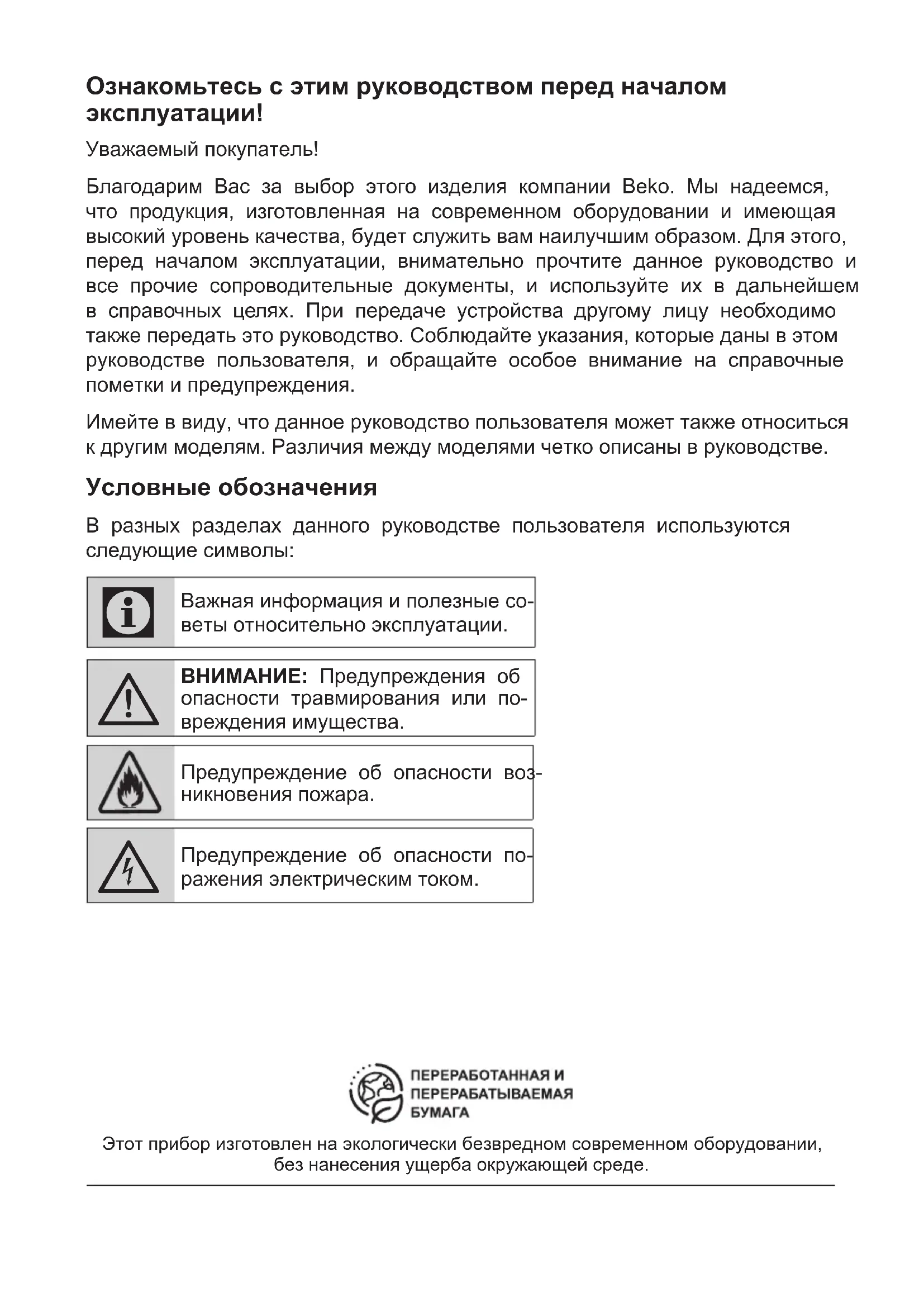 Руководство пользователяОзнакомьтесь с этим руководством перед началом эксплуатации! Уважаемый покупатель! Благодарим Вас за выбор этого изделия компании Beko. Мы надеемся, что продукция, изготовленная на современном оборудовании и имеющая высокий уровень качества, будет служить вам наилучшим образом. Для этого, перед началом эксплуатации, внимательно прочтите данное руководство и все прочие сопроводительные документы, и используйте их в дальнейшем в справочных целях. При передаче устройства другому лицу необходимо также передать это руководство. Соблюдайте указания, которые даны в этом руководстве пользователя, и обращайте особое внимание на справочные пометки и предупреждения. Имейте в виду, что данное руководство пользователя может также относиться к другим моделям. Различия между моделями четко описаны в руководстве. Условные обозначения В разных разделах данного руководстве пользователя используются следующие символы: