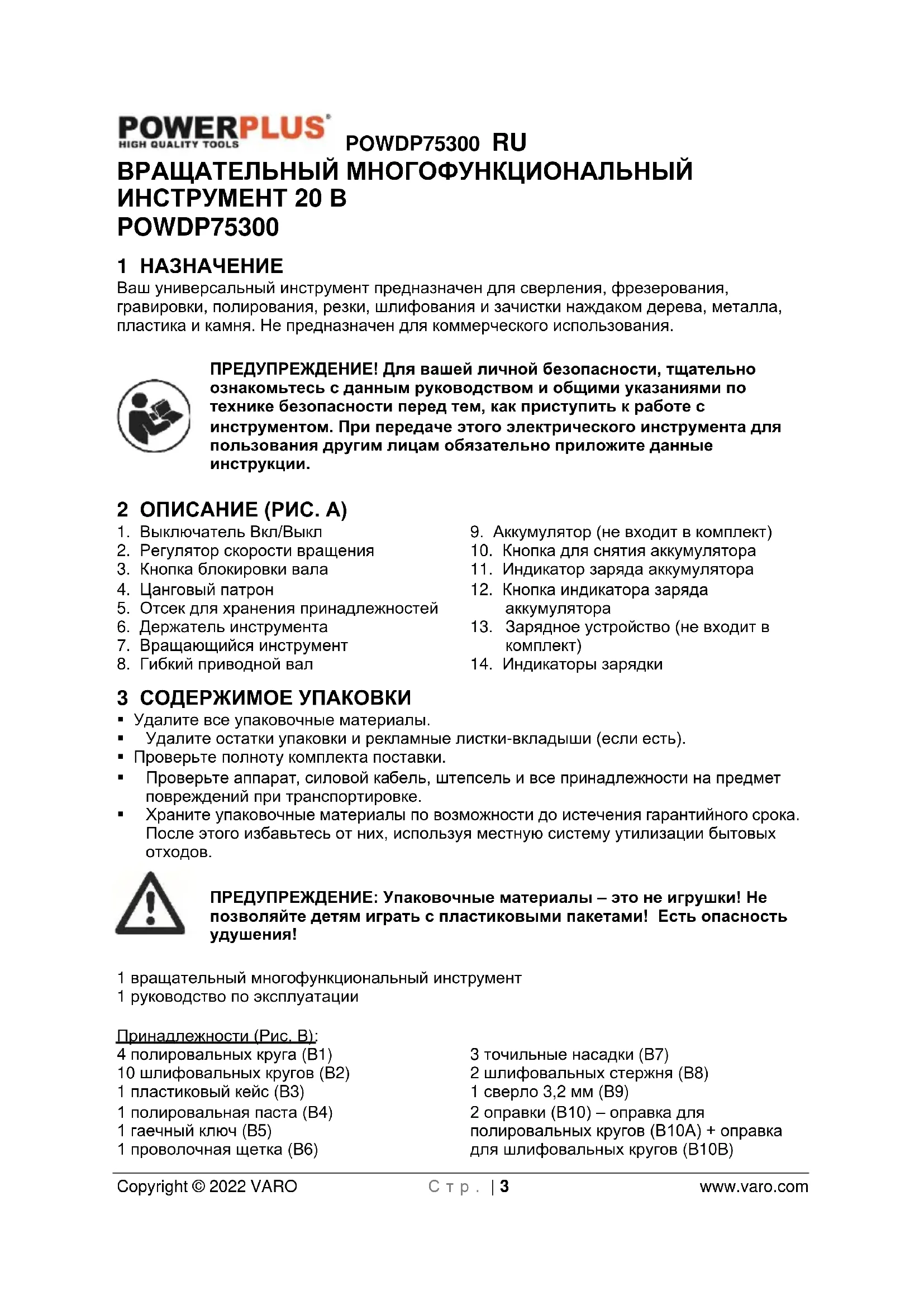 1 вращательный многофункциональный инструмент 1 руководство по эксплуатации Принадлежности (Рис. B): 4 полировальных круга (B1) 10 шлифовальных кругов (B2) 1 пластиковый кейс (B3) 1 полировальная паста (B4) 1 гаечный ключ (B5) 1 проволочная щетка (B6) 3 точильные насадки (B7) 2 шлифовальных стержня (B8) 1 сверло 3,2 мм (B9) 2 оправки (B10) – оправка для полировальных кругов (B10A) + оправка для шлифовальных кругов (B10B)POWDP75300 RU Copyright © 2022 VARO С т р . | 4 www.varo.com 3 алмазные фрезы (B11) 1 фреза для гравировки (B12) 6 шлифовальных лент (B13) 5 отрезных кругов (B14) Если детали отсутствуют или повреждены, обратитесь к своему
