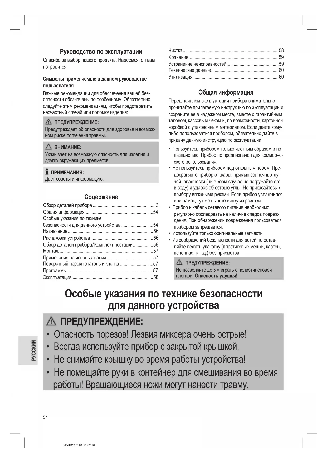 - Не помещайте руки в контейнер для смешивания во время работы! Вращающиеся ножи могут нанести травму.PC-UM1207_IM 21.02.20