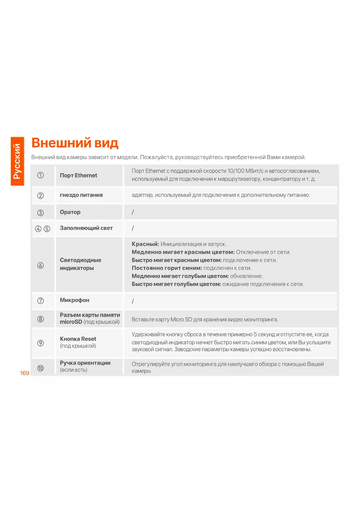 гнездо питания Порт Ethernet Кнопка Reset (под крышкой) Ручка ориентации (если есть) Разъем карты памяти microSD (под крышкой) Внешний вид Внешний вид камеры зависит от модели. Пожалуйста, руководствуйтесь приобретенной Вами камерой.170