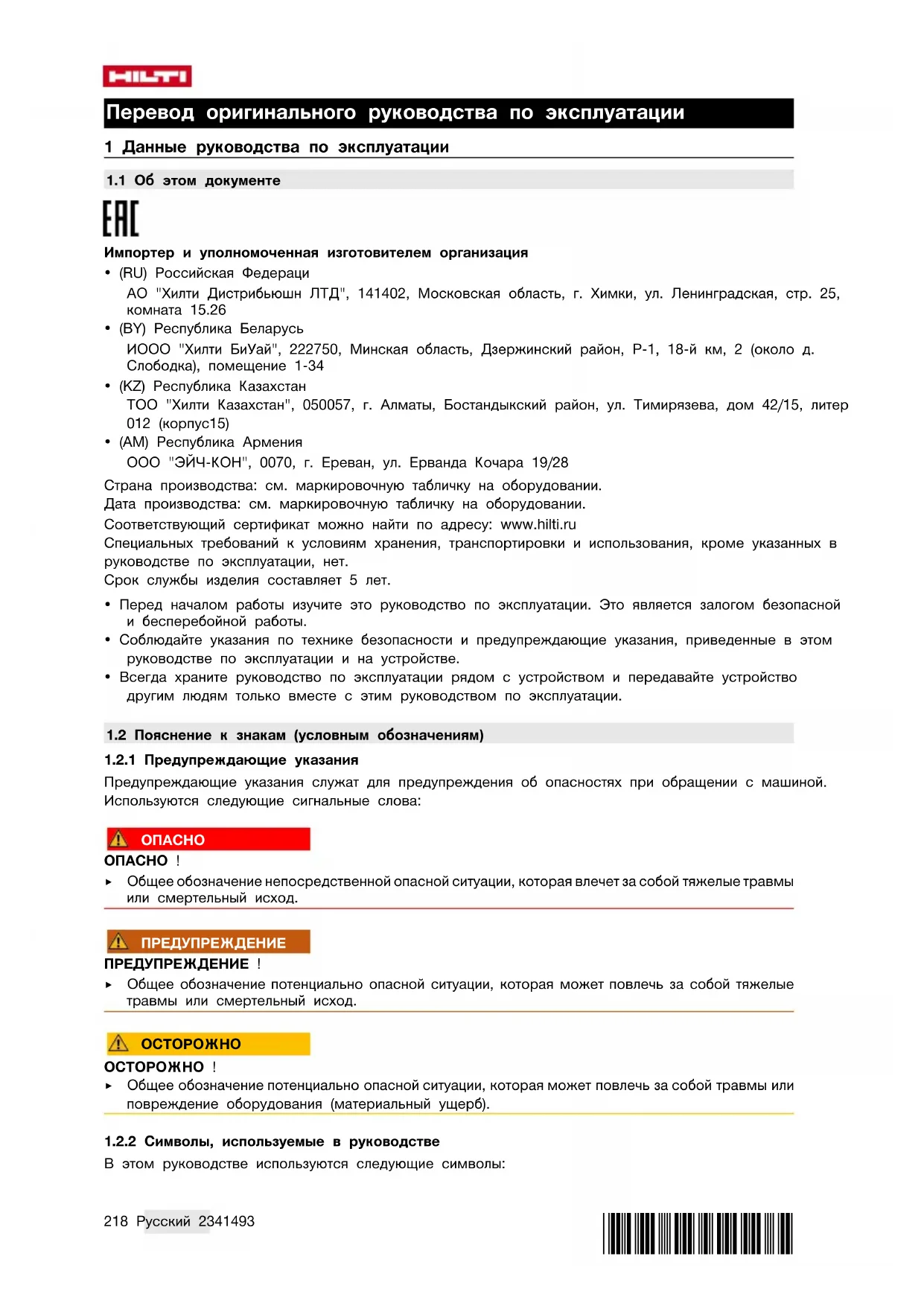 Настоящим фирма-изготовитель с полной ответственностью заявляет, что данное изделие соответ- ствует действующим директивам и нормам. Техническая документация (оригиналы) хранится здесь: Hilti Entwicklungsgesellschaft mbH | Zulassung Geräte | Hiltistraße 6 | 86916 Kaufering, Германия