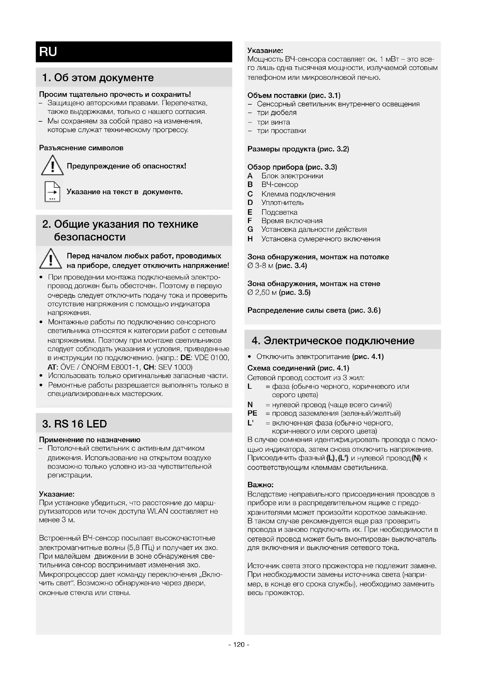 При установке убедиться, что расстояние до марш- рутизаторов или точек доступа WLAN составляет не менее 3 м. Встроенный ВЧ-сенсор посылает высокочастотные электромагнитные волны (5,8 ГГц ) и получает их эхо. При малейшем движении в зоне обнаружения све- тильника сенсор воспринимает изменения эхо. Микропроцессор дает команду переключения „Вклю- чить свет“. Возможно обнаружение через двери, оконные стекла или стены.- 121 -