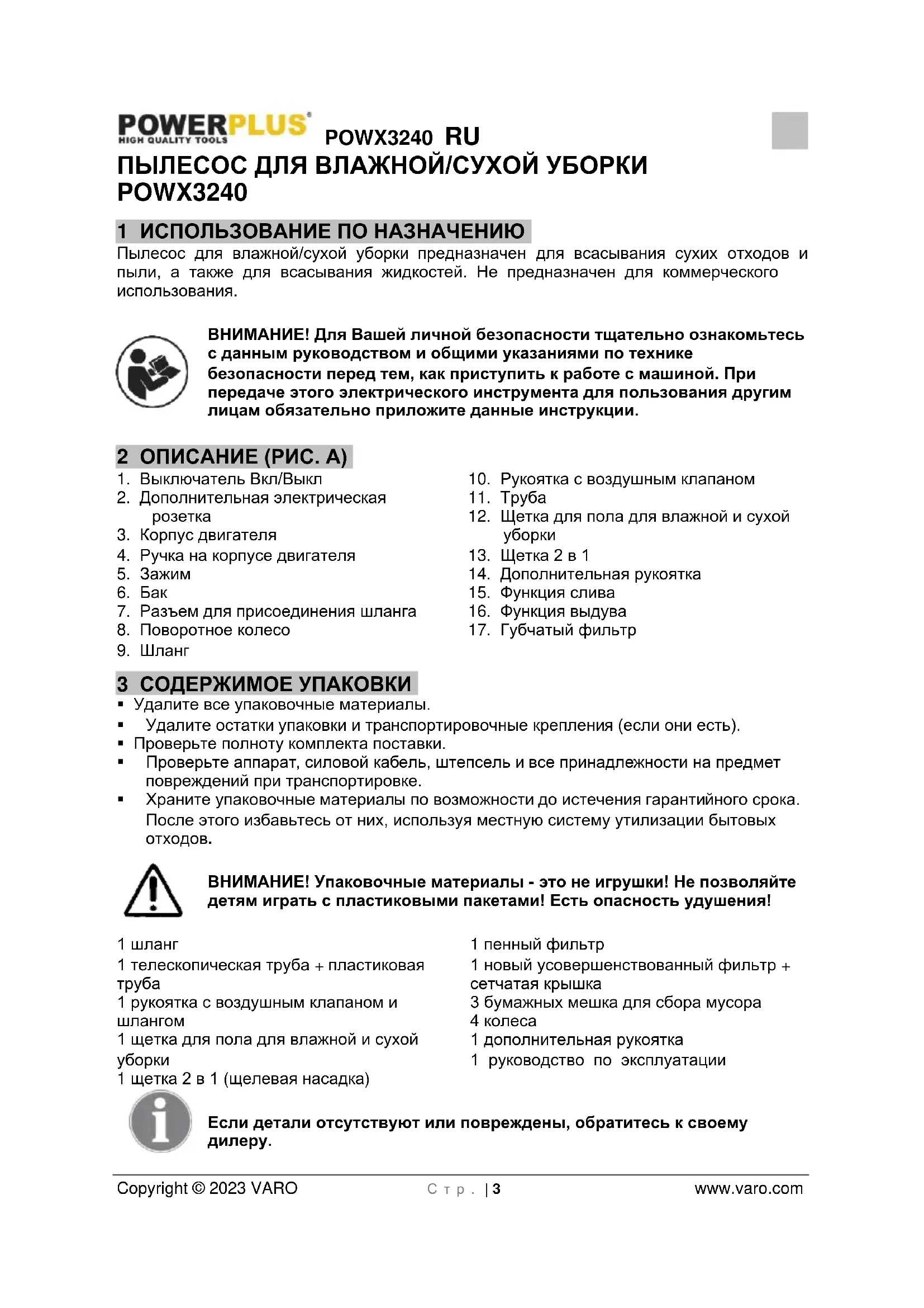 - 16 ДЕКЛАРАЦИЯ О СООТВЕТСТВИИ POWX3240 RU Copyright © 2023 VARO С т р . | 3 www.varo.com ПЫЛЕСОС ДЛЯ ВЛАЖНОЙ/СУХОЙ УБОРКИ POWX3240 1 ИСПОЛЬЗОВАНИЕ ПО НАЗНАЧЕНИЮ Пылесос для влажной/сухой уборки предназначен для всасывания сухих отходов и пыли, а также для всасывания жидкостей. Не предназначен для коммерческого использования. ВНИМАНИЕ! Для Вашей личной безопасности тщательно ознакомьтесь с данным руководством и общими указаниями по технике безопасности перед тем, как приступить к работе с машиной. При передаче этого электрического инструмента для пользования другим лицам обязательно приложите данные инструкции. 2 ОПИСАНИЕ (РИС. A) p. 11