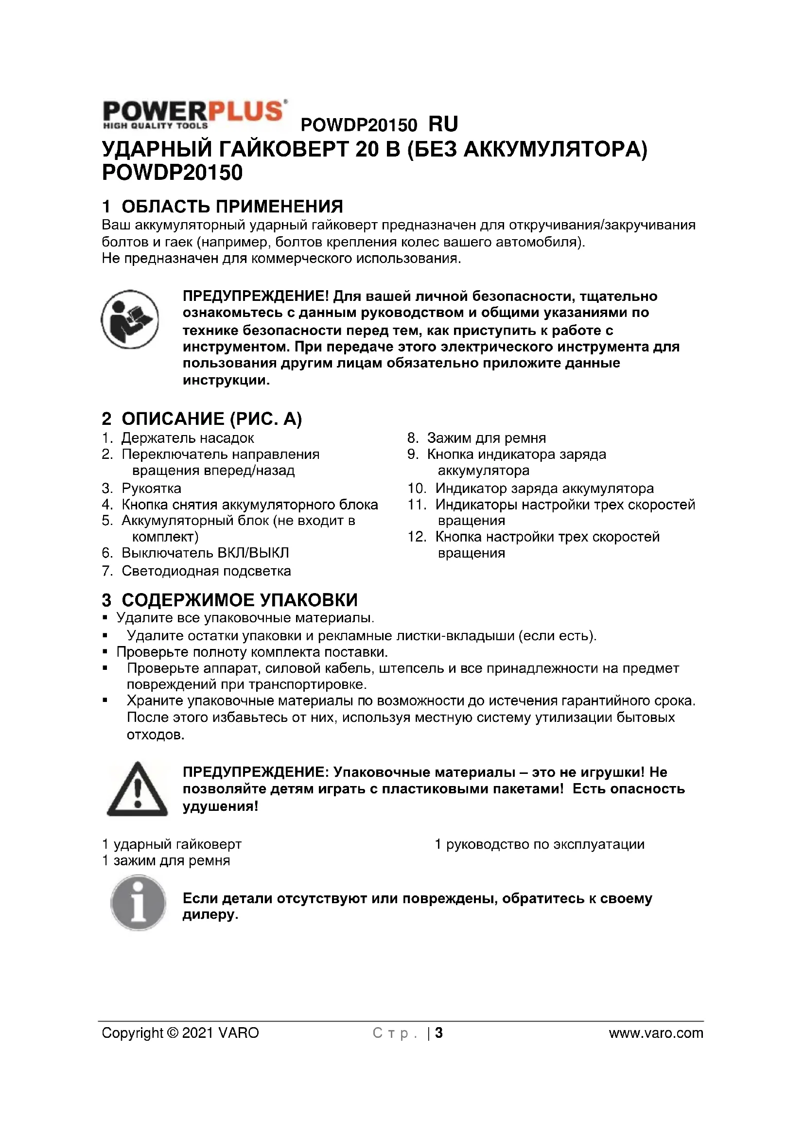 - 15 ДЕКЛАРАЦИЯ О СООТВЕТСТВИИ POWDP20150 RU Copyright © 2021 VARO С т р . | 3 www.varo.com УДАРНЫЙ ГАЙКОВЕРТ 20 В (БЕЗ АККУМУЛЯТОРА) POWDP20150 1 ОБЛАСТЬ ПРИМЕНЕНИЯ Ваш аккумуляторный ударный гайковерт предназначен для откручивания/закручивания болтов и гаек (например, болтов крепления колес вашего автомобиля). Не предназначен для коммерческого использования. ПРЕДУПРЕЖДЕНИЕ! Для вашей личной безопасности, тщательно ознакомьтесь с данным руководством и общими указаниями по технике безопасности перед тем, как приступить к работе с инструментом. При передаче этого электрического инструмента для пользования другим лицам обязательно приложите данные инструкции. 2 ОПИСАНИЕ (РИС. А) p. 15