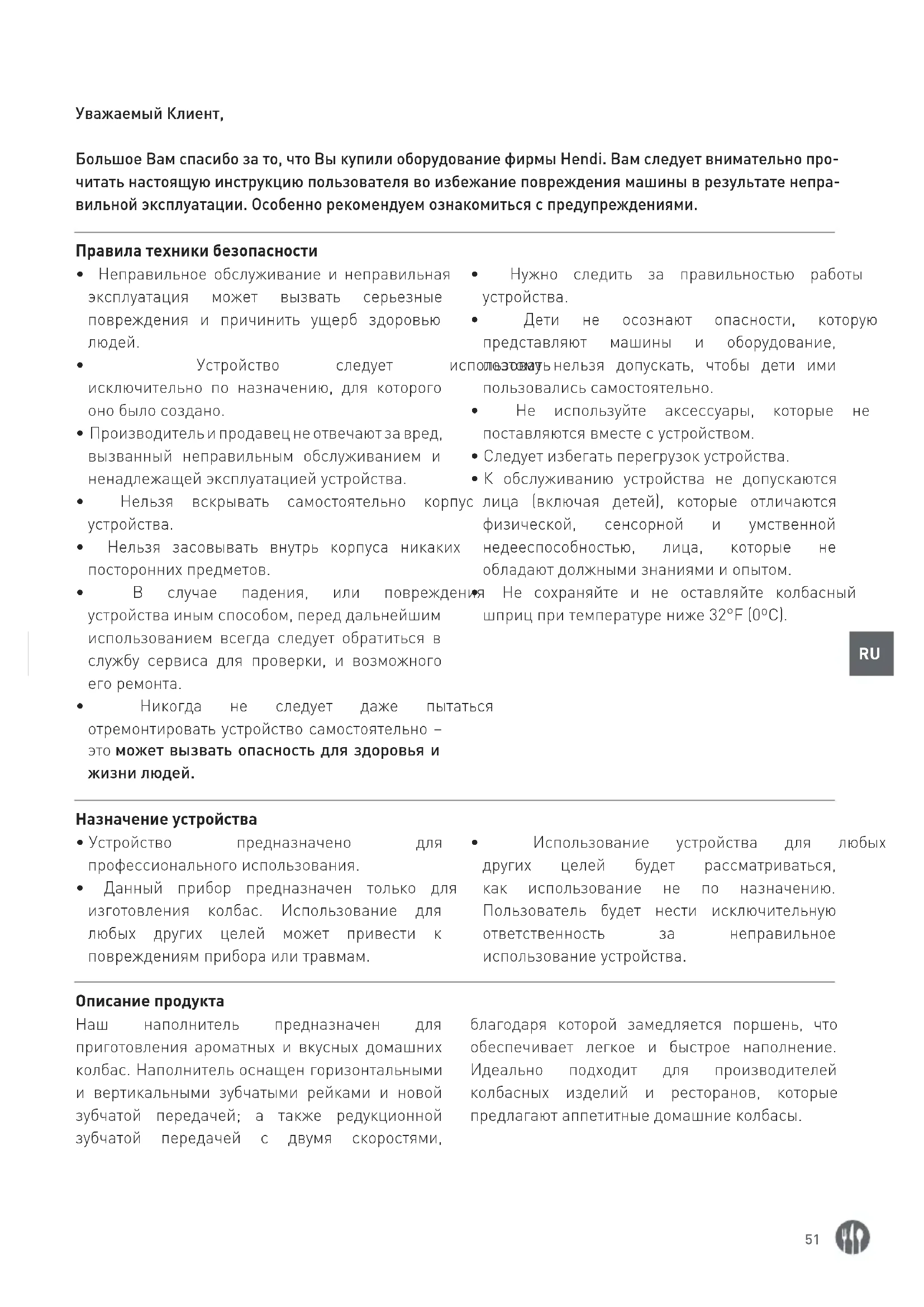 - Данный прибор предназначен только для изготовления колбас. Использование для любых других целей может привести к повреждениям прибора или травмам.