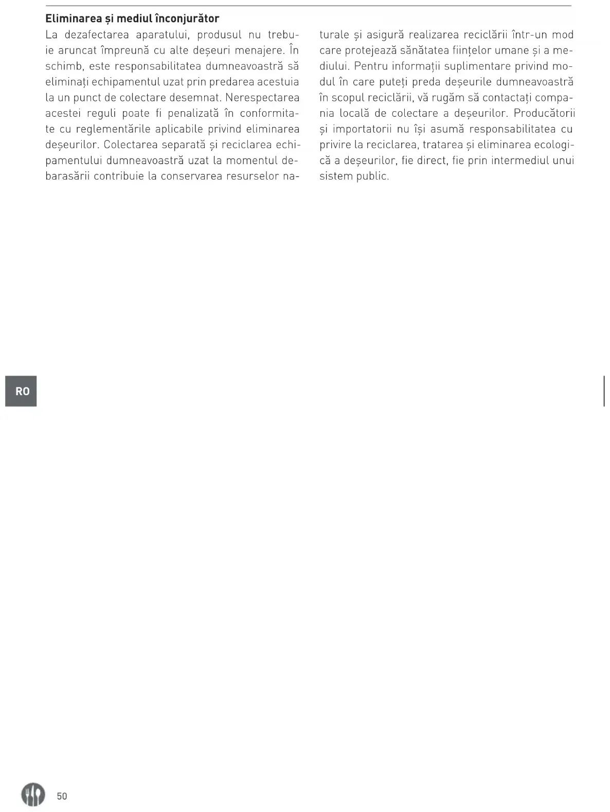 Утилизация и защита окружающей среды В случае вывода оборудования из эксплуатации, продукт нельзя утилизировать вместе с другими бытовыми отходами. Пользователь несет ответ- ственность за передачу оборудования в соот- ветствующий пункт приёма техники бывшей в употреблении. Несоблюдение вышеуказанного положения может привести к наложению штра- фов в соответствии с действующими правилами в отношении утилизации отходов. Селективный сбор и утилизация использованного оборудо- вания способствуют сохранению природных ресурсов и обеспечивают рециркуляцию таким образом, который не вреден для здоровья и окружающей среды. Для получения дополни- тельной информации о том, где можно отдать использованное оборудование для утилизации, обратитесь в местную компанию по сбору отхо- дов. Производитель и импортер не несут ответ- ственности за рециркуляцию и переработку от- ходов экологически безопасным способом, как непосредственно, так и в рамках государствен- ной системы.58