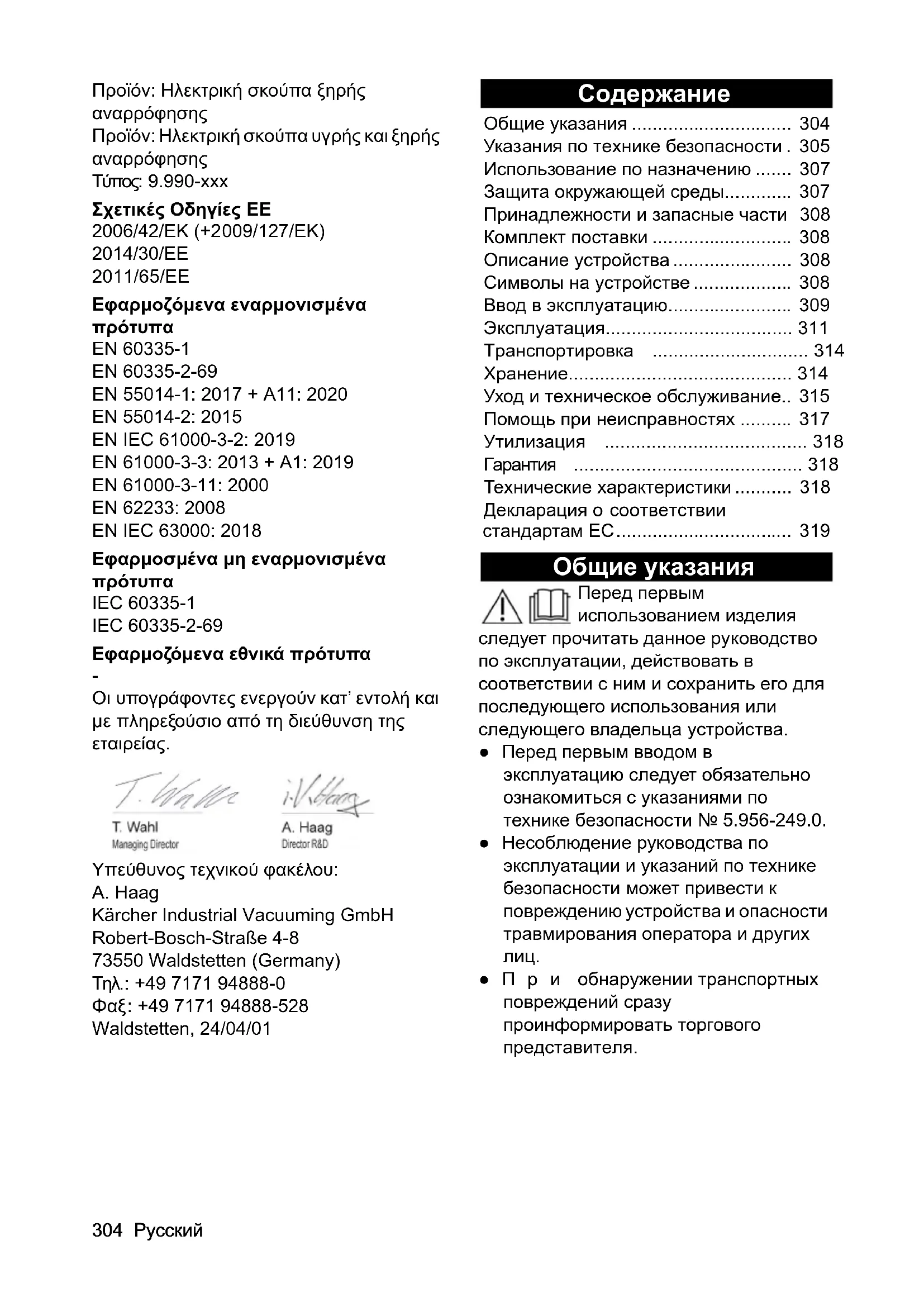 Нижеподписавшиеся лица действуют по поручению и по доверенности руководства компании. Лицо, ответственное за ведение документации: А. Хаг (A. Haag) Kärcher Industrial Vacuuming GmbH Robert-Bosch-Straße 4-8 73550 Waldstetten (Германия) Тел.: +49 7171 94888-0 Факс: +49 7171 94888-528 г. Вальдштеттен, 24/04/01