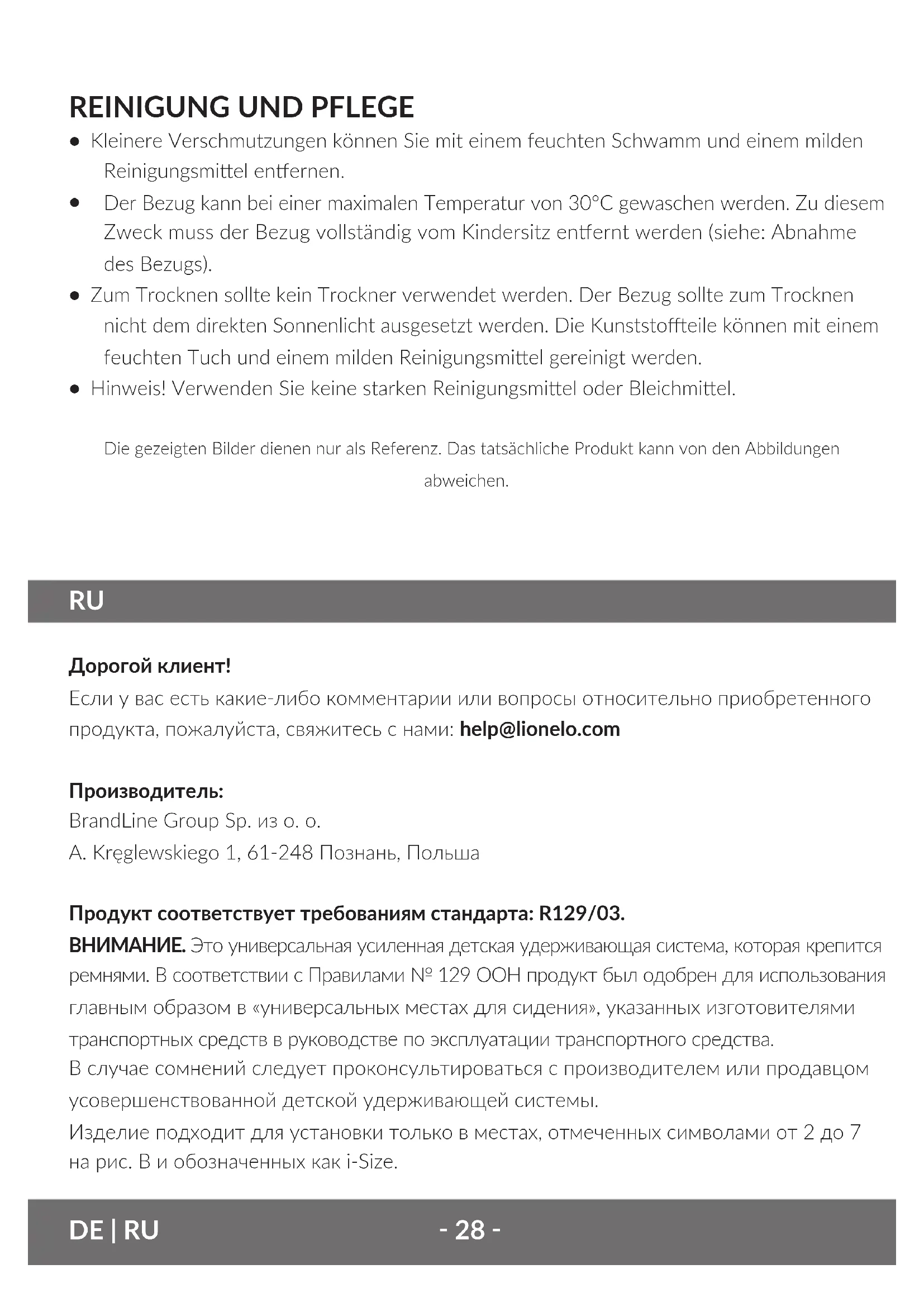 Дорогой клиент! Если у вас есть какие-либо комментарии или вопросы относительно приобретенного продукта, пожалуйста, свяжитесь с нами: help@lionelo.com Производитель: BrandLine Group Sp. из о. о. A. Kręglewskiego 1, 61-248 Познань, Польша Продукт соответствует требованиям стандарта: R129/03. ВНИМАНИЕ. Это универсальная усиленная детская удерживающая система, которая крепится ремнями. В соответствии с Правилами № 129 ООН продукт был одобрен для использования главным образом в «универсальных местах для сидения», указанных изготовителями транспортных средств в руководстве по эксплуатации транспортного средства. В случае сомнений следует проконсультироваться с производителем или продавцом усовершенствованной детской удерживающей системы. Изделие подходит для установки только в местах, отмеченных символами от 2 до 7 на рис. B и обозначенных как i-Size. DE | RU‑ 29 ‑ RU Сиденье предназначено для установки лицом назад только с использованием трехточечного ремня безопасности (рис. B). Не устанавливайте автокресло в месте с активированной передней подушкой безопасности. Автокресло рекомендуется устанавливать только на задние сиденья автомобиля. ПРЕДУПРЕЖДЕНИЯ: