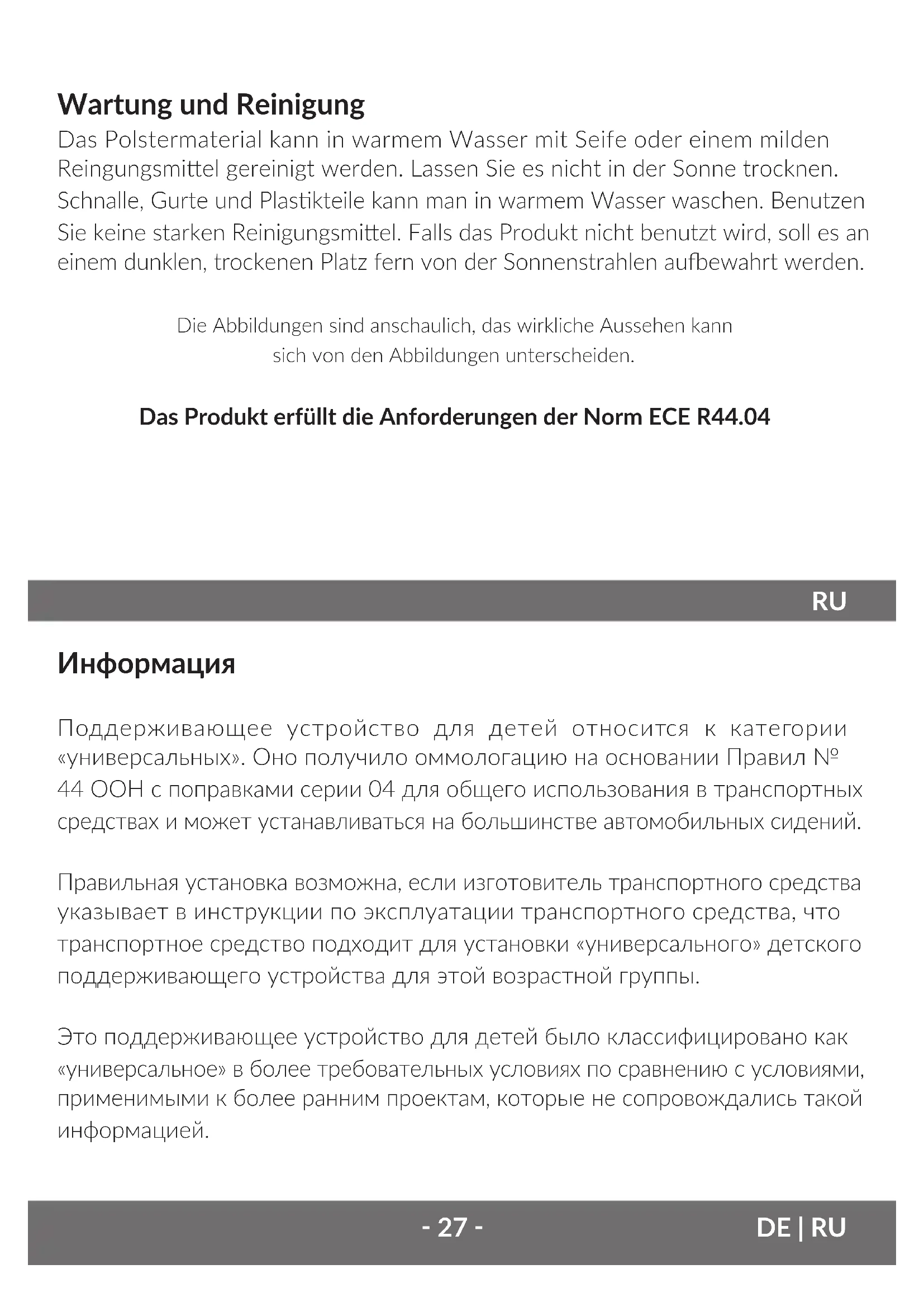 Твердые и пластиковые детали поддерживающего устройства для детей должны быть размещены и установлены таким образом, чтобы при нормальных‑ 29 ‑ RU условиях эксплуатации транспортного средства они не блокировались перемещающимся сиденьем или дверью транспортного средства.