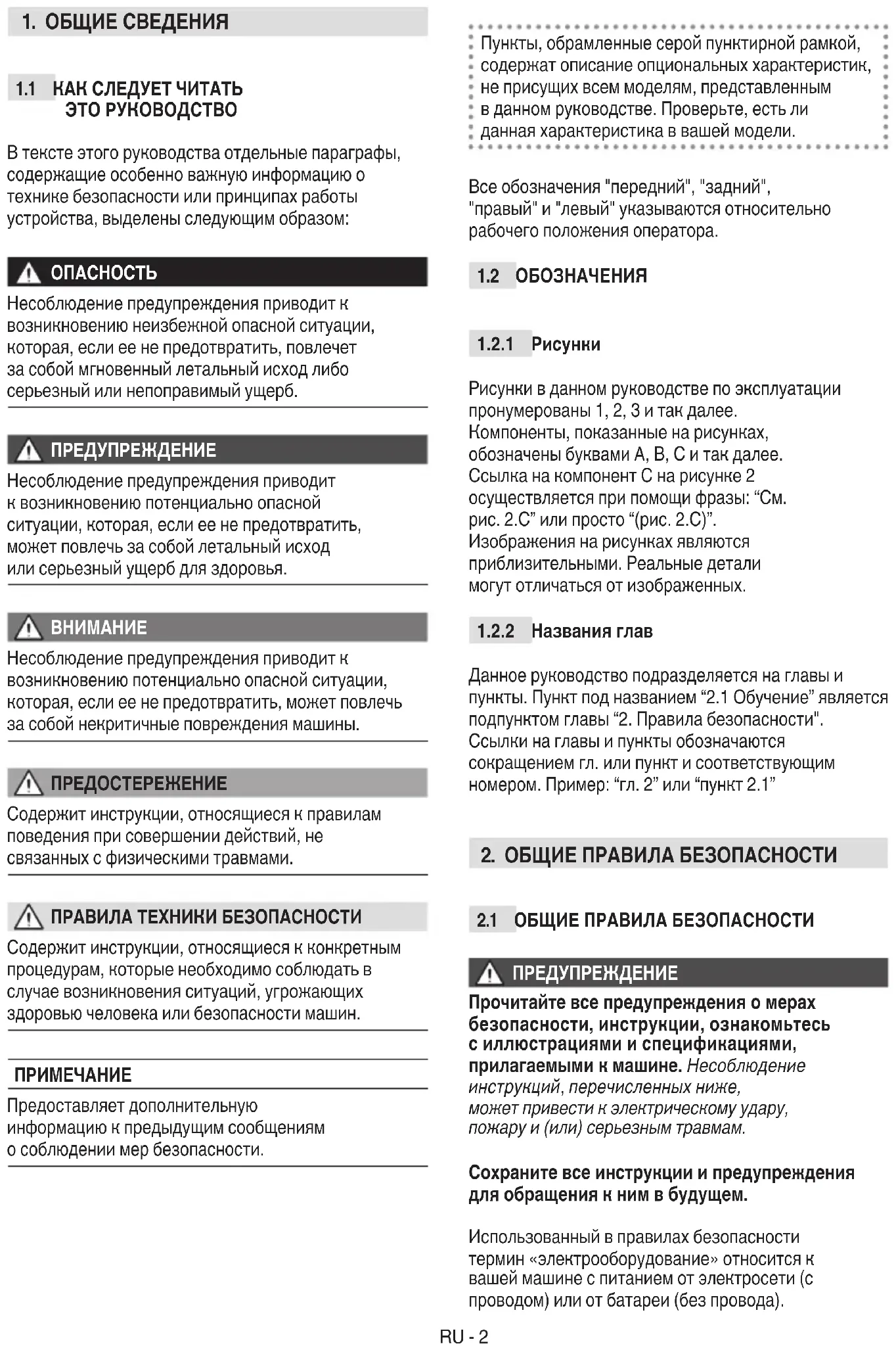 В этом руководстве изложены все указания, необходимые для управления машиной и для правильного выполнения основных операций технического обслуживания, которое должен выполнять пользователь. Для выполнения всех действий по регулировке и обслуживанию, не описанных в этом руководстве, обращайтесь к Вашему дистрибьютору или в специализированный сервисный центр, располагающий подготовленным персоналом и оборудованием, необходимыми для правильного выполнения работы, поддержания уровня безопасности и восстановления первоначального состояния машины. Операции, выполненные в неподходящих для этого структурах или неквалифицированными людьми, приводят к аннулированию всех видов гарантии и снимают с изготовителя всю ответственность и обязательства.