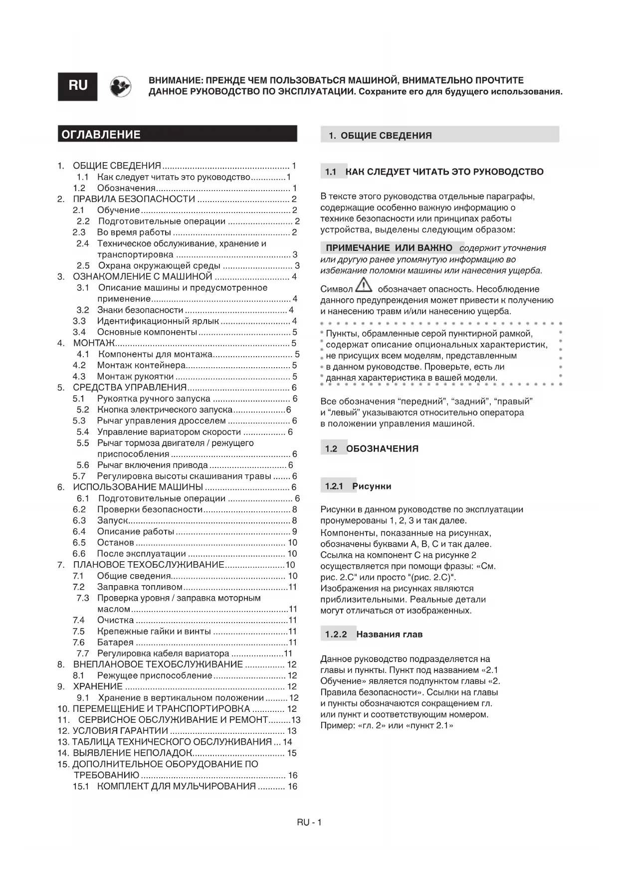 Проверка уровня / заправка топливом Каждый раз перед использованием пункт 6.1.1 / 7.2 * Проверка уровня / заправка моторным маслом Каждый раз перед использованием пункт 6.1.1 / 7.3 * Проверка и чистка воздушного фильтра * * Проверка и чистка контактов свечи * * Замена свечи * * Уровень заряда батареи * пункт 7.6 * * См. руководство двигателя.RU - 15 ** Данную операцию следует выполнять при первых признаках неисправной работы *** Операция, которая должна быть выполнена через вашего дистрибьютора или в специализированном сервисном центре