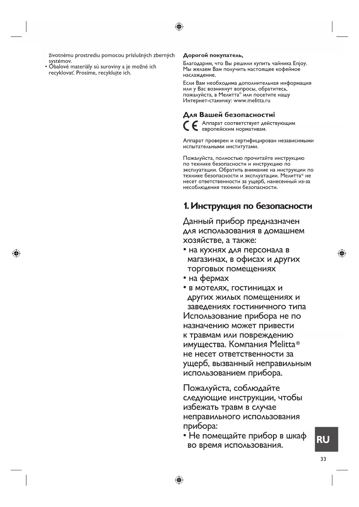 - Elektrickéspotrebičeneodhadzujtedobežnéhokon- tajnera. Spotrebič zlikvidujte spôsobom šetrným k SK33 Дорогой покупатель, Благодарим, что Вы решили купить чайника Enjoy. Мы желаем Вам получить настоящее кофейное наслаждение. Если Вам необходима дополнительная информация или у Вас возникнут вопросы, обратитесь, пожалуйста, в Мелитта