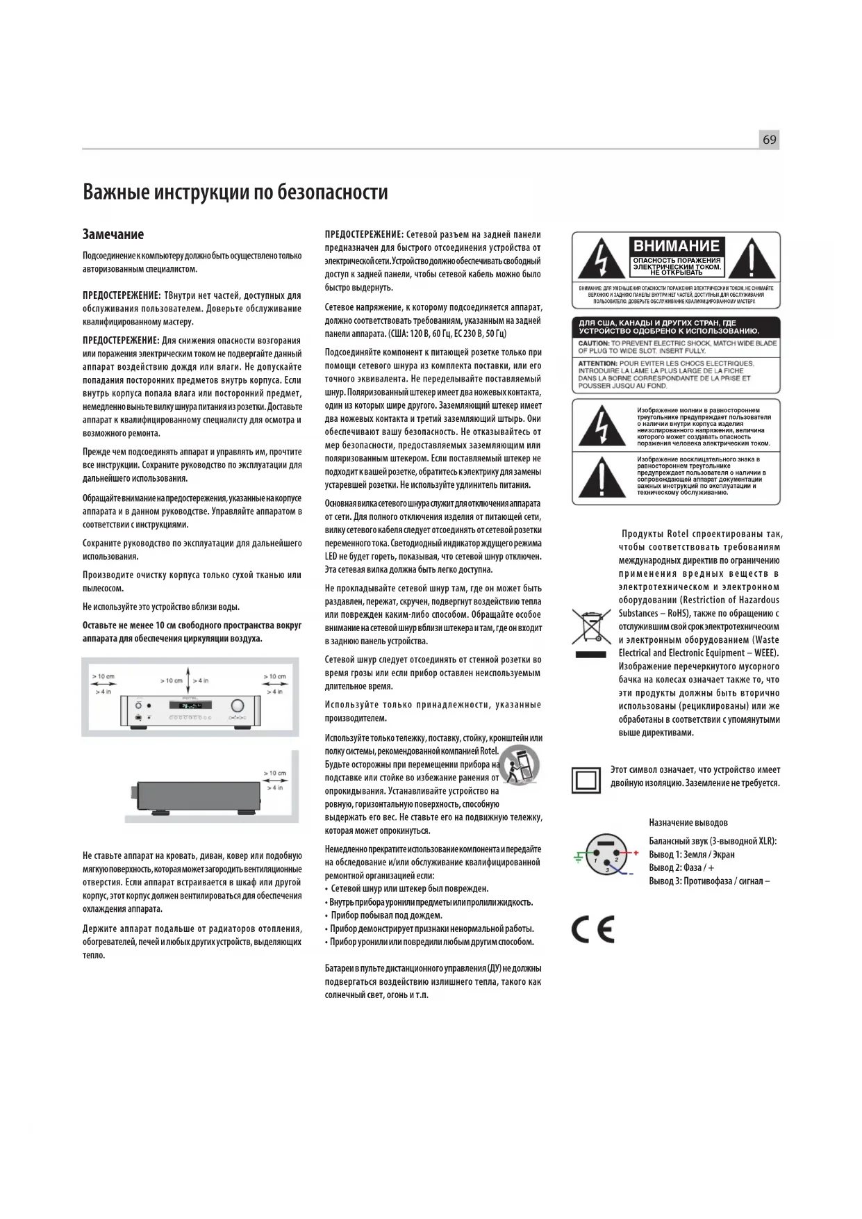 Продукты Rotel спроектированы так, чтобы соответствовать требованиям международных директив по ограничению применения вредных веществ в электротехническом и электронном оборудовании (Restriction of Hazardous Substances – RoHS), также по обращению с отслужившим свой срок электротехническим и электронным оборудованием (Waste Electrical and Electronic Equipment – WEEE). Изображение перечеркнутого мусорного бачка на колесах означает также то, что эти продукты должны быть вторично использованы (рециклированы) или же обработаны в соответствии с упомянутыми выше директивами. Этот символ означает, что устройство имеет двойную изоляцию. Заземление не требуется. Важные инструкции по безопасности ПРЕДОСТЕРЕЖЕНИЕ: Сетевой разъем на задней панели предназначен для быстрого отсоединения устройства от электрической сети. Устройство должно обеспечивать свободный доступ к задней панели, чтобы сетевой кабель можно было быстро выдернуть. Сетевое напряжение, к которому подсоединяется аппарат, должно соответствовать требованиям, указанным на задней панели аппарата. (США: 120 В, 60 Гц, ЕС 230 В, 50 Гц) Подсоединяйте компонент к питающей розетке только при помощи сетевого шнура из комплекта поставки, или его точного эквивалента. Не переделывайте поставляемый шнур. Поляризованный штекер имеет два ножевых контакта, один из которых шире другого. Заземляющий штекер имеет два ножевых контакта и третий заземляющий штырь. Они обеспечивают вашу безопасность. Не отказывайтесь от мер безопасности, предоставляемых заземляющим или поляризованным штекером. Если поставляемый штекер не подходит к вашей розетке, обратитесь к электрику для замены устаревшей розетки. Не используйте удлинитель питания. Основная вилка сетевого шнура служит для отключения аппарата от сети. Для полного отключения изделия от питающей сети, вилку сетевого кабеля следует отсоединять от сетевой розетки переменного тока. Светодиодный индикатор ждущего режима LED не будет гореть, показывая, что сетевой шнур отключен. Эта сетевая вилка должна быть легко доступна. Не прокладывайте сетевой шнур там, где он может быть раздавлен, пережат, скручен, подвергнут воздействию тепла или поврежден каким-либо способом. Обращайте особое внимание на сетевой шнур вблизи штекера и там, где он входит в заднюю панель устройства. Сетевой шнур следует отсоединять от стенной розетки во время грозы или если прибор оставлен неиспользуемым длительное время. Используйте только принадлежности, указанные производителем. Используйте только тележку, поставку, стойку, кронштейн или полку системы, рекомендованной компанией Rotel. Будьте осторожны при перемещении прибора на подставке или стойке во избежание ранения от опрокидывания. Устанавливайте устройство на ровную, горизонтальную поверхность, способную выдержать его вес. Не ставьте его на подвижную тележку, которая может опрокинуться. Немедленно прекратите использование компонента и передайте на обследование и/или обслуживание квалифицированной ремонтной организацией если: