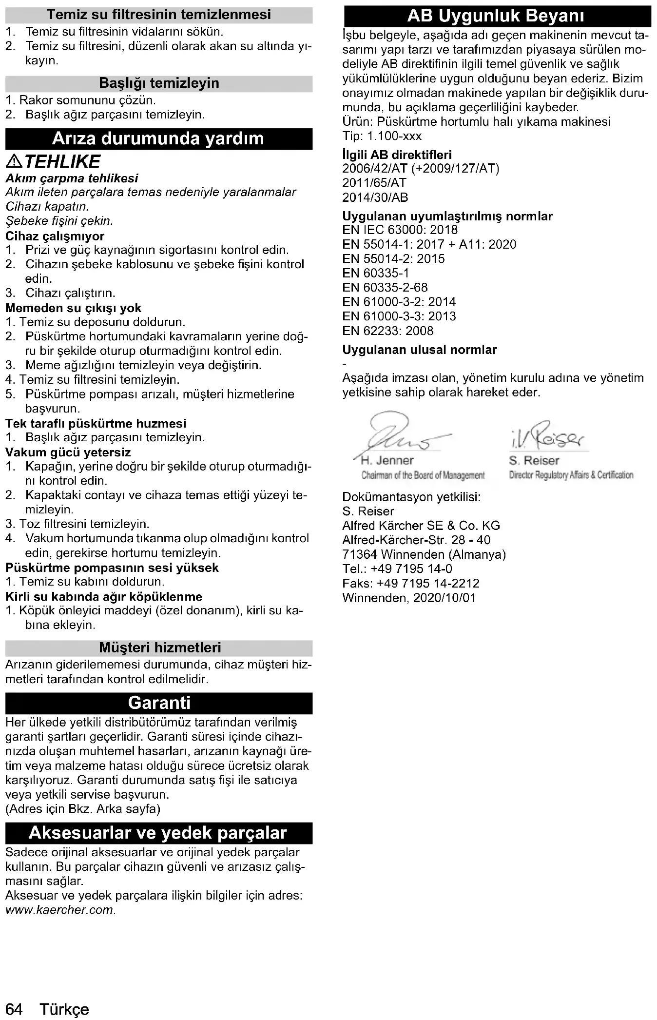 Использовать только оригинальные принадлежности и запасные части. Только они гарантируют безопасную и бесперебойную работу устройства. Для получения информации о принадлежностях и запчастях см. www.kaercher.com. Декларация о соответствии стандартам ЕС Настоящим заявляем, что концепция, конструкция и исполнение указанной ниже машины отвечают соответствующим основным требованиям директив ЕС по безопасности и охране здоровья. При любых изменениях машины, не согласованных с нашей компанией, данная декларация теряет свою силу. Изделие: моющий пылесос Тип: 1.100-xxx Действующие директивы ЕС 2006/42/ЕС (+2009/127/ЕС) 2011/65/EС 2014/30/EС Примененные гармонизированные стандарты EN IEC 63000: 2018 EN 55014-1: 2017 + A11: 2020 EN 55014-2: 2015 EN 60335-1 EN 60335-2-68 EN 61000-3-2: 2014 EN 61000-3-3: 2013 EN 62233: 2008 Примененные национальные стандарты