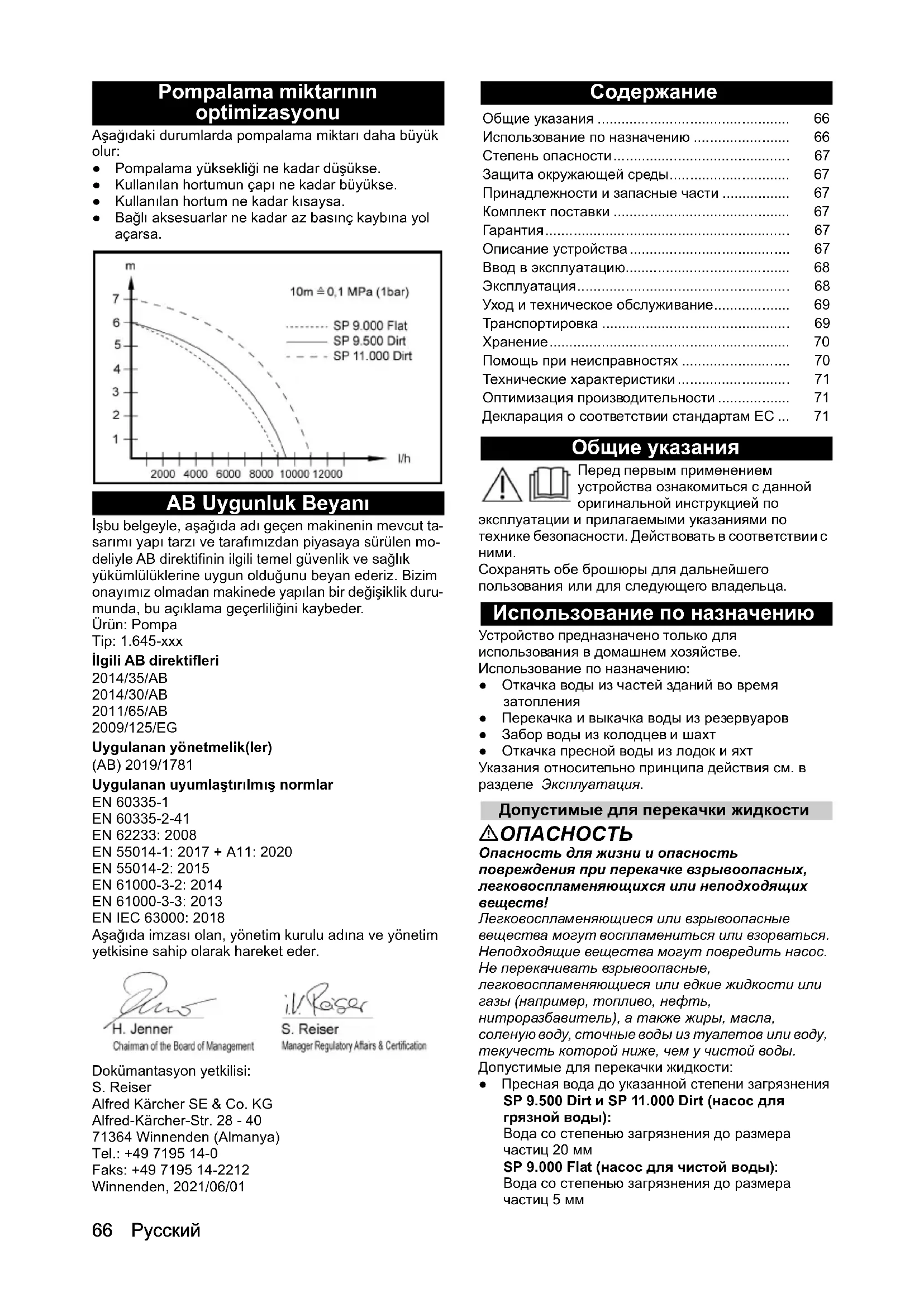 Оптимизация производительности Производительность тем больше: ●чем меньше высота подачи; ●чем больше диаметр используемого шланга; ●чем короче используемый шланг; ●чем меньше падение давления, обусловленное подсоединением дополнительного оборудования. Декларация о соответствии стандартам ЕС Настоящим заявляем, что концепция, конструкция и исполнение указанной ниже машины отвечают соответствующим основным требованиям директив ЕС по безопасности и охране здоровья. При любых изменениях машины, не согласованных с нашей компанией, данная декларация теряет свою силу. Изделие: Насос Тип: 1.645-xxx Действующие директивы ЕС 2014/35/ЕС 2014/30/EС 2011/65/EС 2009/125/ЕС Применяемый(-ые) регламент(-ы) (ЕС) 2019/1781 Примененные гармонизированные стандарты EN 60335-1 EN 60335-2-41 EN 62233: 2008 EN 55014-1: 2017 + A11: 2020 EN 55014-2: 2015 EN 61000-3-2: 2014 EN 61000-3-3: 2013 EN IEC 63000: 2018 Нижеподписавшиеся лица действуют от имени и по доверенности Правления. Лицо, ответственное за ведение документации: Ш. Райзер (S. Reiser) Alfred Kärcher SE & Co. KG Alfred-Kärcher-Str. 28–40 71364 Winnenden (Germany) Тел.: +49 7195 14-0 Факс: +49 7195 14-2212 г. Винненден, 01.06.2021