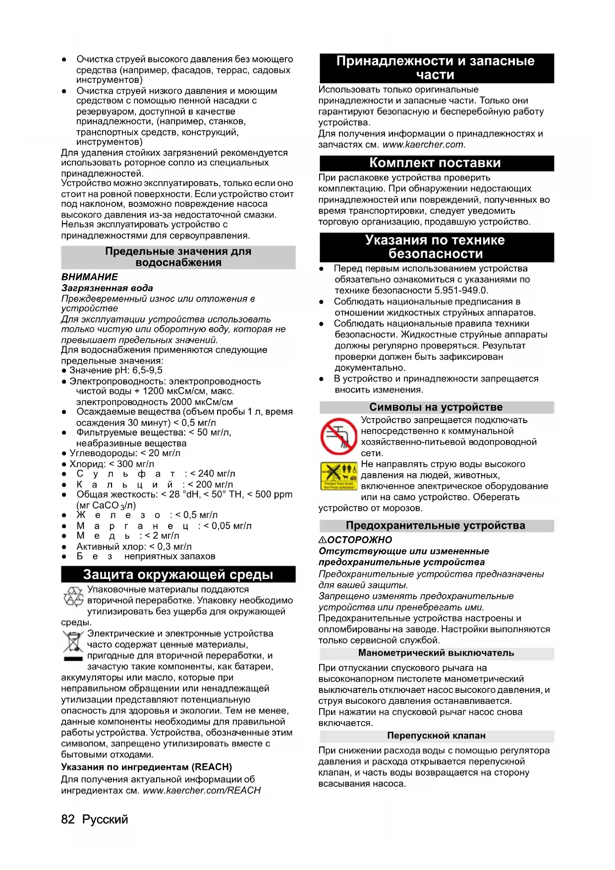 е компоненты необходимы для правильной работы устройства. Устройства, обозначенные этим символом, запрещено утилизировать вместе с бытовыми отходами. Указания по ингредиентам (REACH) Для получения актуальной информации об ингредиентах см. www.kaercher.com/REACH Принадлежности и запасные