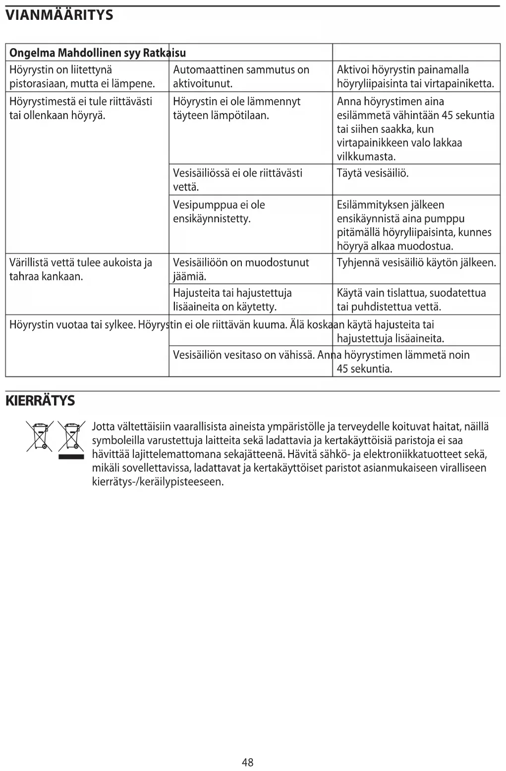 Подождите примерно 45секунд для нагрева отпаривателя. Вода в емкости на исходе. Наполните емкость водой.53 ПОВТОРНАЯ ПЕРЕРАБОТКА