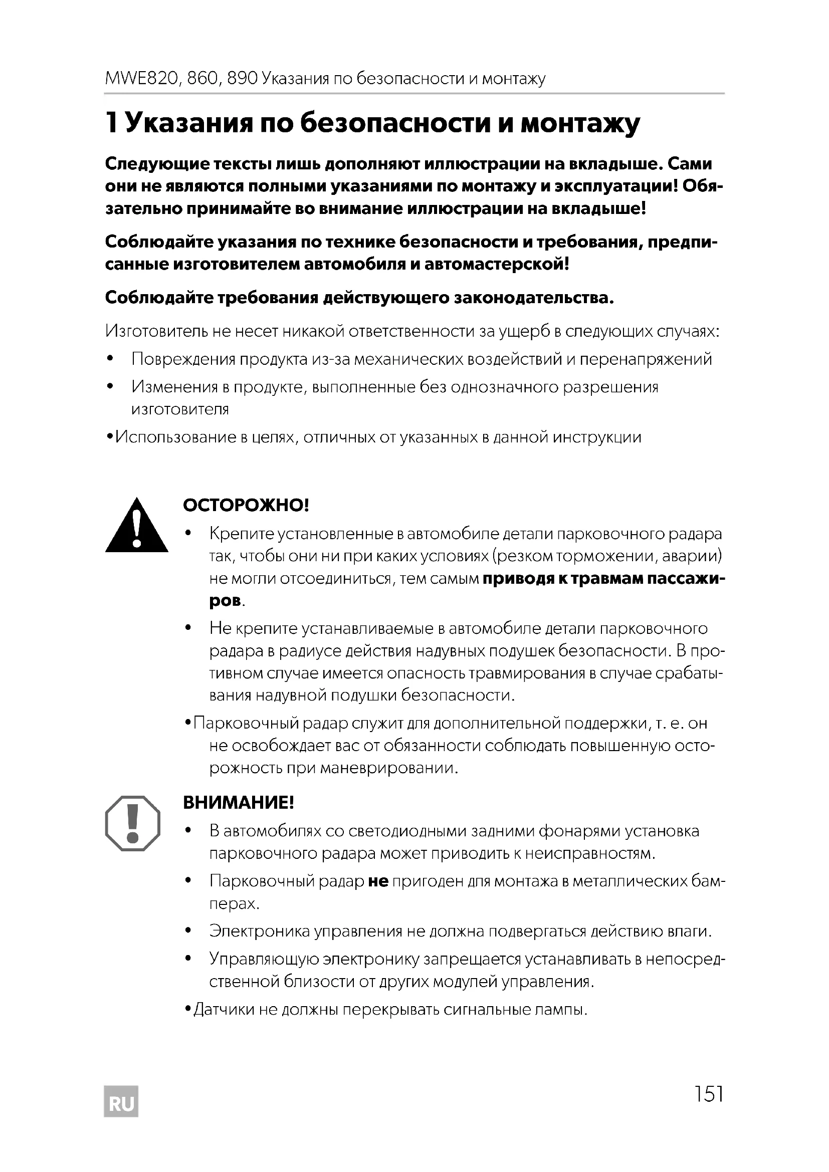 1 Указания по безопасности и монтажу Следующие тексты лишь дополняют иллюстрации на вкладыше. Сами они не являются полными указаниями по монтажу и эксплуатации! Обя- зательно принимайте во внимание иллюстрации на вкладыше! Соблюдайте указания по технике безопасности и требования, предпи- санные изготовителем автомобиля и автомастерской! Соблюдайте требования действующего законодательства. Изготовитель не несет никакой ответственности за ущерб в следующих случаях: