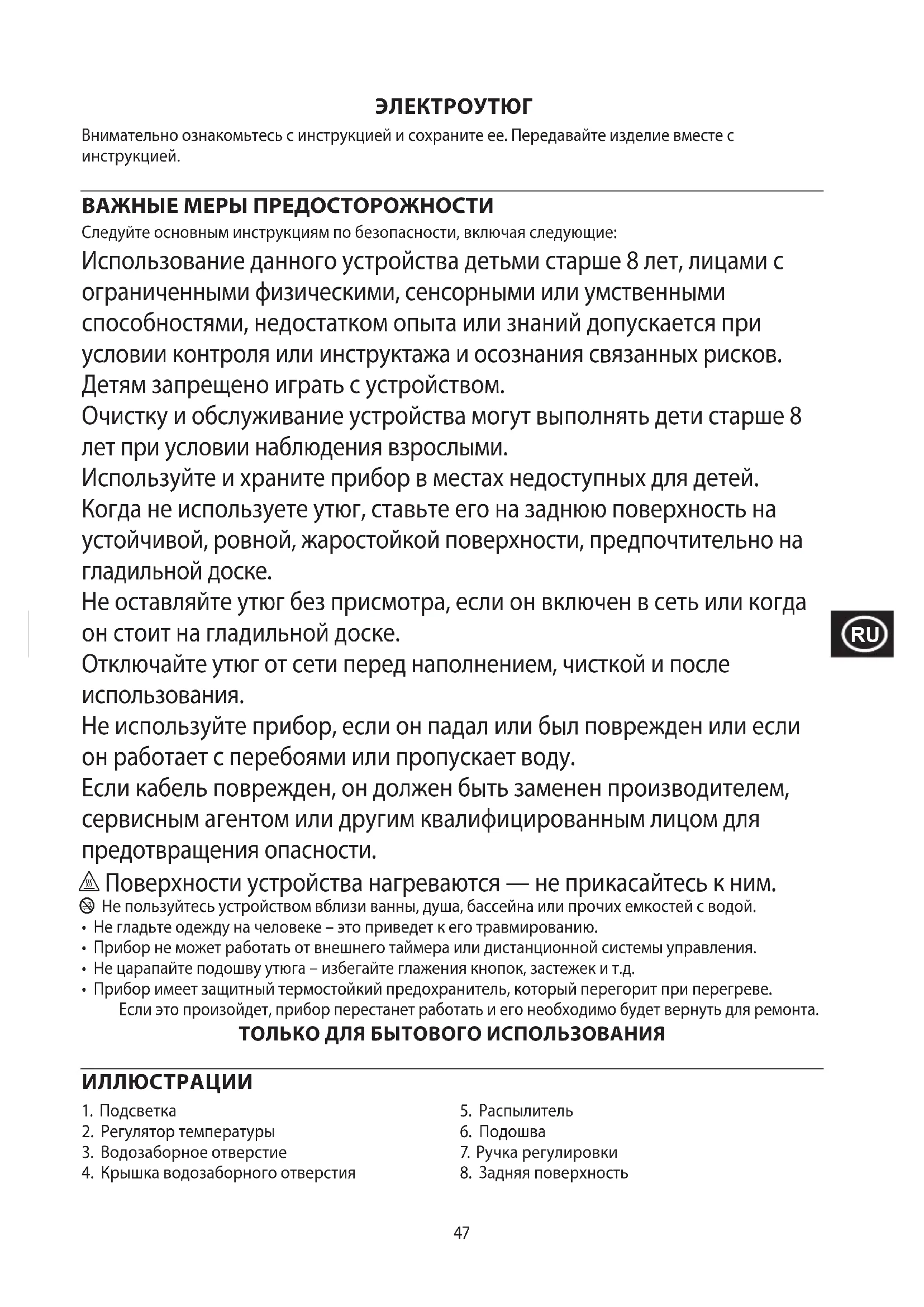 Jotta vältettäisiin vaarallisista aineista ympäristölle ja terveydelle koituvat haitat, näillä symboleilla varustettuja laitteita sekä ladattavia ja kertakäyttöisiä paristoja ei saa hävittää lajittelemattomana sekajätteenä. Hävitä sähkö- ja elektroniikkatuotteet sekä, mikäli sovellettavissa, ladattavat ja kertakäyttöiset paristot asianmukaiseen viralliseen kierrätys-/keräilypisteeseen.47 ЭЛЕКТРОУТЮГ Внимательно ознакомьтесь с инструкцией и сохраните ее. Передавайте изделие вместе с инструкцией. ВАЖНЫЕ МЕРЫ ПРЕДОСТОРОЖНОСТИ Следуйте основным инструкциям по безопасности, включая следующие: Использование данного устройства детьми старше 8 лет, лицами с ограниченными физическими, сенсорными или умственными способностями, недостатком опыта или знаний допускается при условии контроля или инструктажа и осознания связанных рисков. Детям запрещено играть с устройством. Очистку и обслуживание устройства могут выполнять дети старше 8 лет при условии наблюдения взрослыми. Используйте и храните прибор в местах недоступных для детей. Когда не используете утюг, ставьте его на заднюю поверхность на устойчивой, ровной, жаростойкой поверхности, предпочтительно на гладильной доске. Не оставляйте утюг без присмотра, если он включен в сеть или когда он стоит на гладильной доске. Отключайте утюг от сети перед наполнением, чисткой и после использования. Не используйте прибор, если он падал или был поврежден или если он работает с перебоями или пропускает воду. Если кабель поврежден, он должен быть заменен производителем, сервисным агентом или другим квалифицированным лицом для предотвращения опасности. h Поверхности устройства нагреваются — не прикасайтесь к ним. b Не пользуйтесь устройством вблизи ванны, душа, бассейна или прочих емкостей с водой.