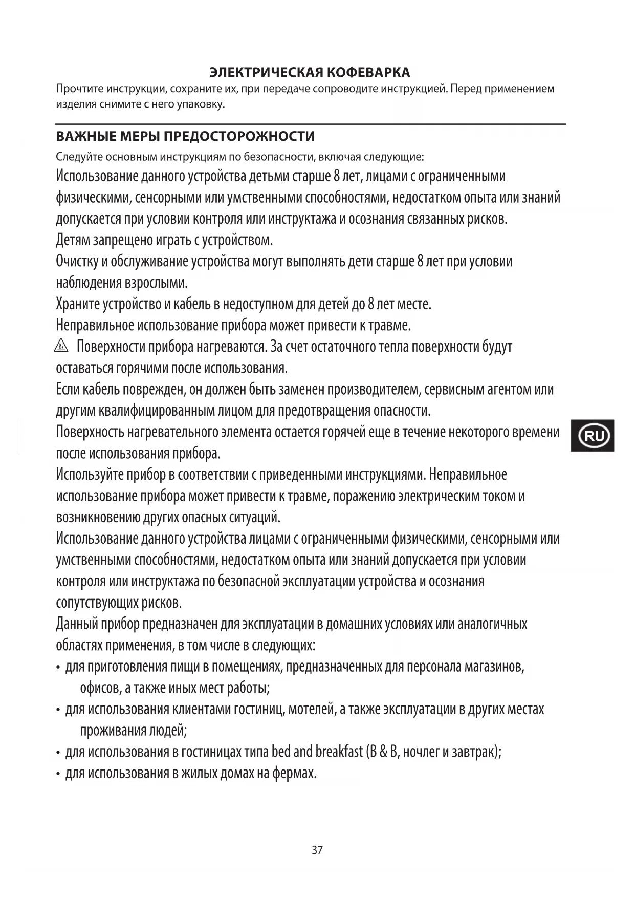 ЭЛЕКТРИЧЕСКАЯ КОФЕВАРКА Прочтите инструкции, сохраните их, при передаче сопроводите инструкцией. Перед применением изделия снимите с него упаковку. ВАЖНЫЕ МЕРЫ ПРЕДОСТОРОЖНОСТИ Следуйте основным инструкциям по безопасности, включая следующие: Использование данного устройства детьми старше 8 лет, лицами с ограниченными физическими, сенсорными или умственными способностями, недостатком опыта или знаний допускается при условии контроля или инструктажа и осознания связанных рисков. Детям запрещено играть с устройством. Очистку и обслуживание устройства могут выполнять дети старше 8 лет при условии наблюдения взрослыми. Храните устройство и кабель в недоступном для детей до 8 лет месте. Неправильное использование прибора может привести к травме. h Поверхности прибора нагреваются. За счет остаточного тепла поверхности будут оставаться горячими после использования. Если кабель поврежден, он должен быть заменен производителем, сервисным агентом или другим квалифицированным лицом для предотвращения опасности. Поверхность нагревательного элемента остается горячей еще в течение некоторого времени после использования прибора. Используйте прибор в соответствии с приведенными инструкциями. Неправильное использование прибора может привести к травме, поражению электрическим током и возникновению других опасных ситуаций. Использование данного устройства лицами с ограниченными физическими, сенсорными или умственными способностями, недостатком опыта или знаний допускается при условии контроля или инструктажа по безопасной эксплуатации устройства и осознания сопутствующих рисков. Данный прибор предназначен для эксплуатации в домашних условиях или аналогичных областях применения, в том числе в следующих: