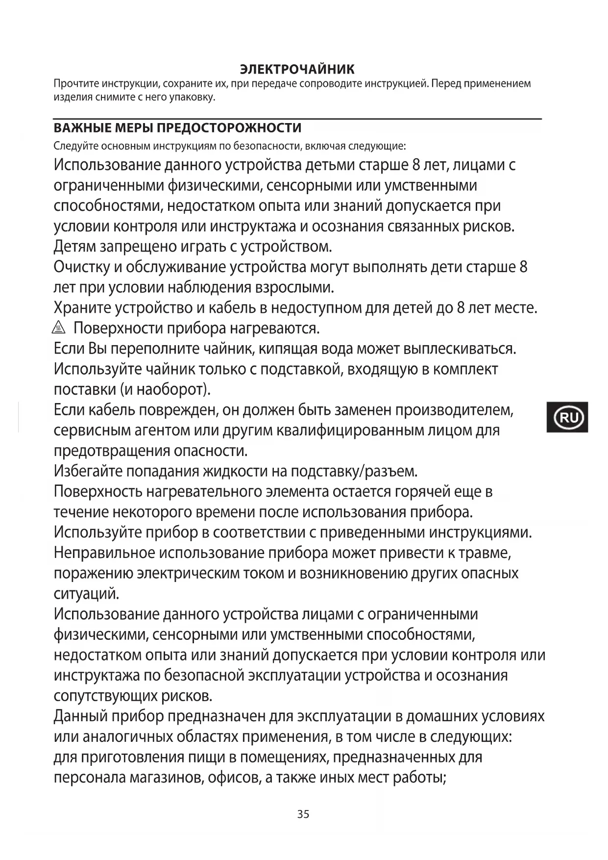 Jotta vältettäisiin vaarallisista aineista ympäristölle ja terveydelle koituvat haitat, näillä symboleilla varustettuja laitteita sekä ladattavia ja kertakäyttöisiä paristoja ei saa hävittää lajittelemattomana sekajätteenä. Hävitä sähkö- ja elektroniikkatuotteet sekä, mikäli sovellettavissa, ladattavat ja kertakäyttöiset paristot asianmukaiseen viralliseen kierrätys-/keräilypisteeseen.35 ЭЛЕКТРОЧАЙНИК Прочтите инструкции, сохраните их, при передаче сопроводите инструкцией. Перед применением изделия снимите с него упаковку. ВАЖНЫЕ МЕРЫ ПРЕДОСТОРОЖНОСТИ Следуйте основным инструкциям по безопасности, включая следующие: Использование данного устройства детьми старше 8 лет, лицами с ограниченными физическими, сенсорными или умственными способностями, недостатком опыта или знаний допускается при условии контроля или инструктажа и осознания связанных рисков. Детям запрещено играть с устройством. Очистку и обслуживание устройства могут выполнять дети старше 8 лет при условии наблюдения взрослыми. Храните устройство и кабель в недоступном для детей до 8 лет месте. h Поверхности прибора нагреваются. Если Вы переполните чайник, кипящая вода может выплескиваться. Используйте чайник только с подставкой, входящую в комплект поставки (и наоборот). Если кабель поврежден, он должен быть заменен производителем, сервисным агентом или другим квалифицированным лицом для предотвращения опасности. Избегайте попадания жидкости на подставку/разъем. Поверхность нагревательного элемента остается горячей еще в течение некоторого времени после использования прибора. Используйте прибор в соответствии с приведенными инструкциями. Неправильное использование прибора может привести к травме, поражению электрическим током и возникновению других опасных