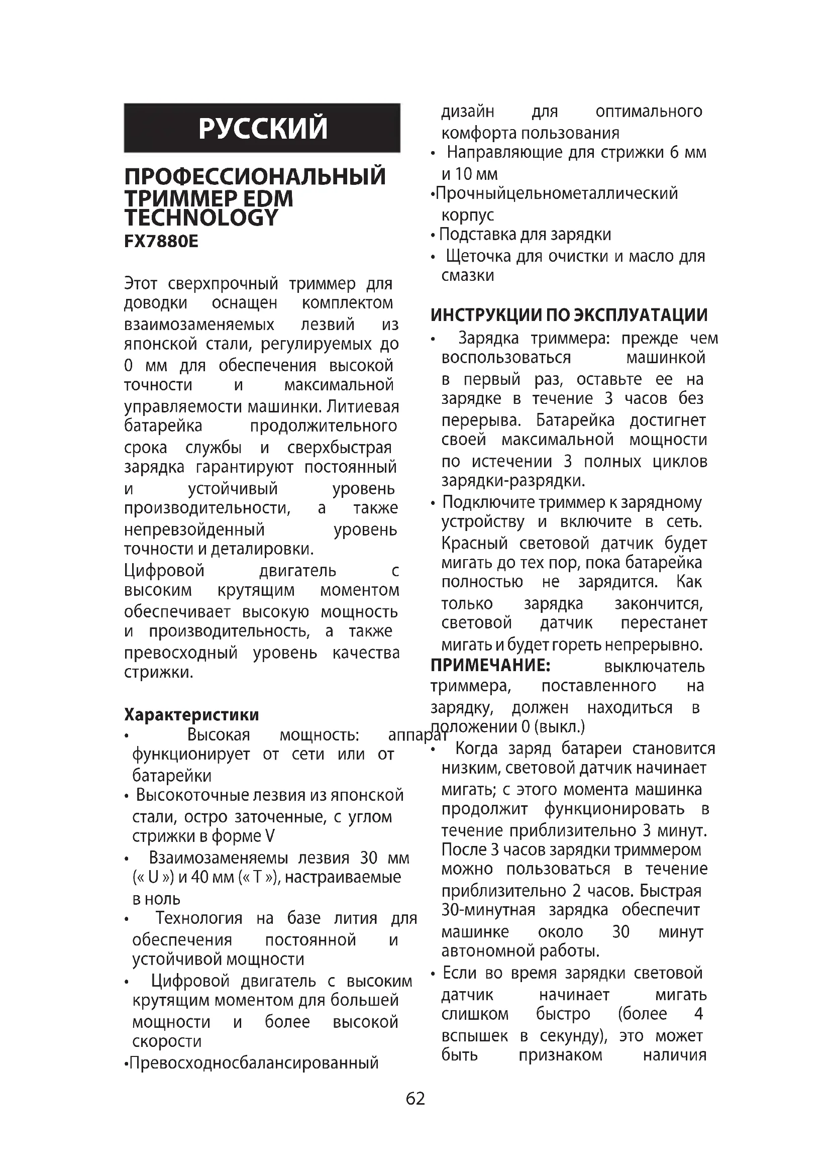 ПРОФЕССИОНАЛЬНЫЙ ТРИММЕР EDM TECHNOLOGY FX7880E Этот сверхпрочный триммер для доводки оснащен комплектом взаимозаменяемых лезвий из японской стали, регулируемых до 0 мм для обеспечения высокой точности и максимальной управляемости машинки. Литиевая батарейка продолжительного срока службы и сверхбыстрая зарядка гарантируют постоянный и устойчивый уровень производительности, а также непревзойденный уровень точности и деталировки. Цифровой двигатель с высоким крутящим моментом обеспечивает высокую мощность и производительность, а также превосходный уровень качества