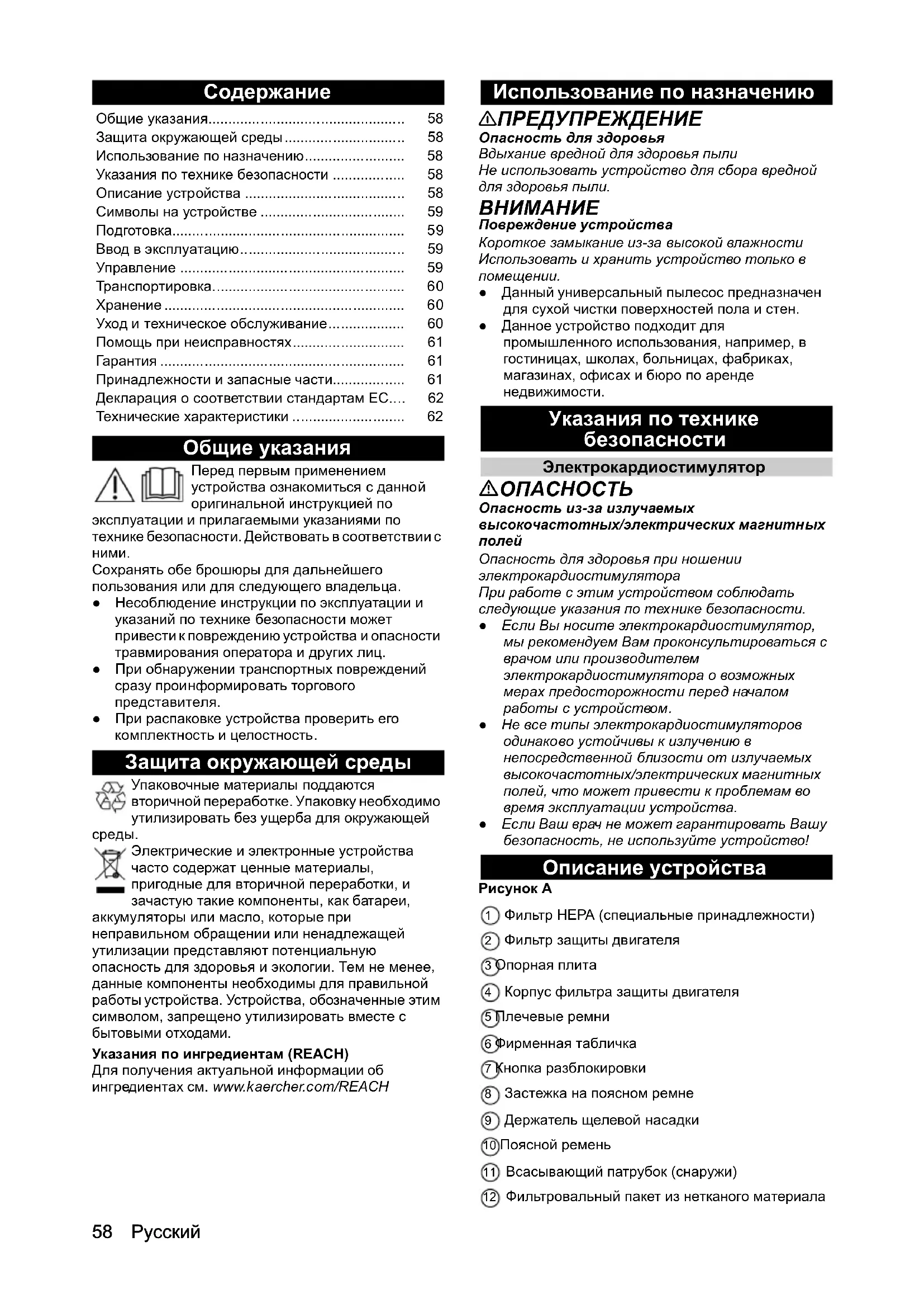 данные компоненты необходимы для правильной работы устройства. Устройства, обозначенные этим символом, запрещено утилизировать вместе с бытовыми отходами. Указания по ингредиентам (REACH) Для получения актуальной информации об ингредиентах см. www.kaercher.com/REACH Использование по назначению 몇 ПРЕДУПРЕЖДЕНИЕ Опасность для здоровья Вдыхание вредной для здоровья пыли Не использовать устройство для сбора вредной для здоровья пыли.