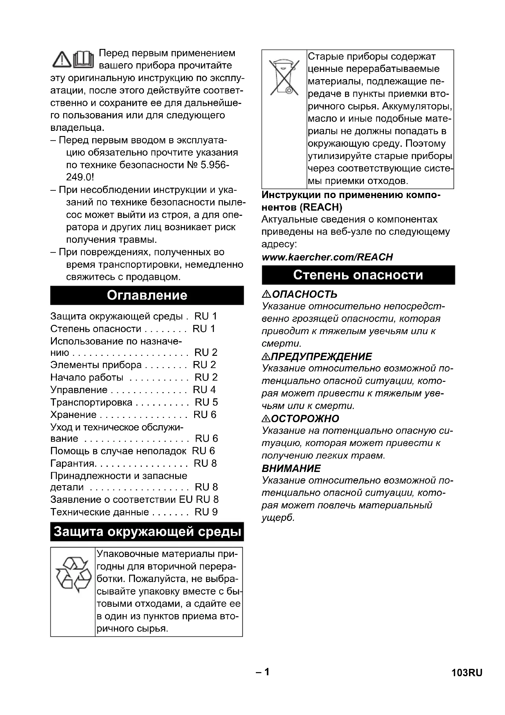 Защита окружающей среды . RU 1 Степень опасности . . . . . . . . RU 1 Использование по назначе- нию . . . . . . . . . . . . . . . . . . . . . RU 2 Элементы прибора . . . . . . . . RU 2 Начало работы . . . . . . . . . . . RU 2 Управление . . . . . . . . . . . . . . RU 4 Транспортировка . . . . . . . . . . RU 5 Хранение . . . . . . . . . . . . . . . . RU 6 Уход и техническое обслужи- вание . . . . . . . . . . . . . . . . . . . RU 6 Помощь в случае неполадок RU 6 Гарантия. . . . . . . . . . . . . . . . . RU 8 Принадлежности и запасные детали . . . . . . . . . . . . . . . . . . RU 8 Заявление о соответствии ЕU RU 8 Технические данные . . . . . . . RU 9 Защита окружающей среды Упаковочные материалы при- годны для вторичной перера- ботки. Пожалуйста, не выбра- сывайте упаковку вместе с бы- товыми отходами, а сдайте ее в один из пунктов приема вто- ричного сырья. Старые приборы содержат ценные перерабатываемые материалы, подлежащие пе- редаче в пункты приемки вто- ричного сырья. Аккумуляторы, масло и иные подобные мате- риалы не должны попадать в окружающую среду. Поэтому утилизируйте старые приборы через соответствующие систе- мы приемки отходов. Степень опасности 103RU– 2 몇 ПРЕДУПРЕЖДЕНИЕ Прибор не предназначен для сбора вредной для здоровья пыли. – Данный пылесос предназначен для непрерывной утилизации большого количества воды (ущерб, причинен- ный наводнением, осушение резер- вуаров, бассейнов или емкостей и т.п.), а также для проведения влаж- ной и сухой чистки поверхностей по- лов и стен. – Этот профессиональный прибор при- меняется, например, в ремесленном производстве, промышленности, в пожарных частях и службах по оказа- нию технической помощи. 1Поплавок 2 Сетевой шнур 3 Штепсельная вилка устройства 4Всасывающий шланг 5 Блокировка всасывающей головки 6 Мусорный бак 7 Держатель кабеля насоса для утили-
