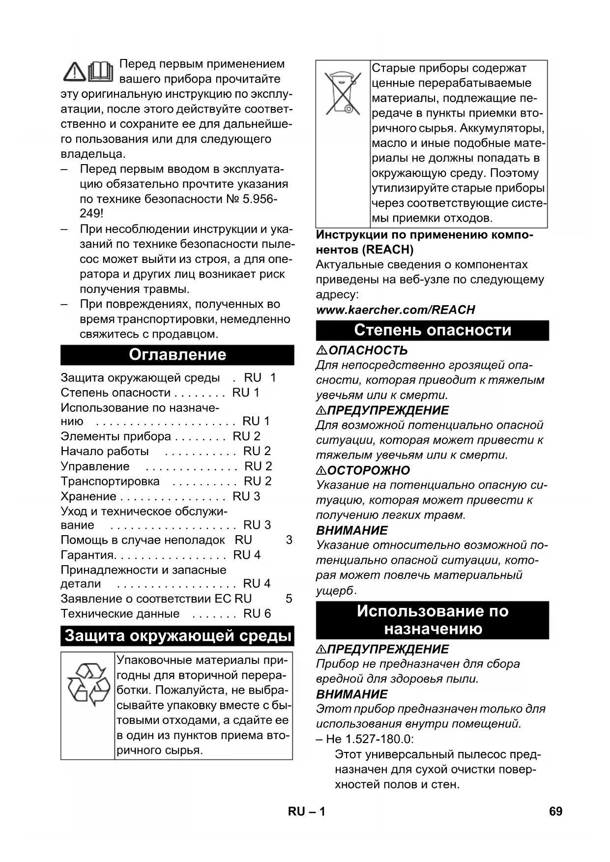 – Перед первым вводом в эксплуата- цию обязательно прочтите указания по технике безопасности № 5.956- 249! – При несоблюдении инструкции и ука- заний по технике безопасности пыле- сос может выйти из строя, а для опе- ратора и других лиц возникает риск получения травмы. – При повреждениях, полученных во время транспортировки, немедленно свяжитесь с продавцом. Инструкции по применению компо- нентов (REACH) Актуальные сведения о компонентах приведены на веб-узле по следующему