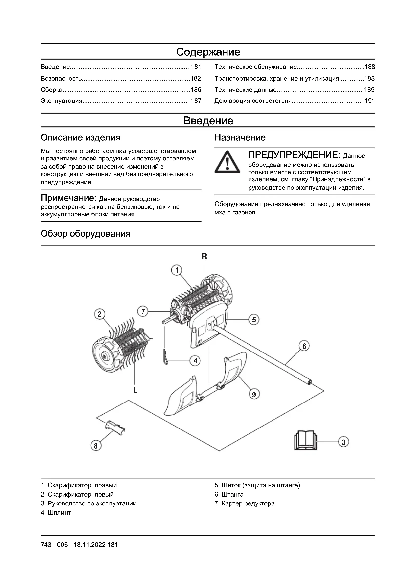 ПРЕДУПРЕЖДЕНИЕ: Данное оборудование можно использовать только вместе с соответствующим изделием, см. главу "Принадлежности" в руководстве по эксплуатации изделия. Оборудование предназначено только для удаления мха с газонов. Обзор оборудования