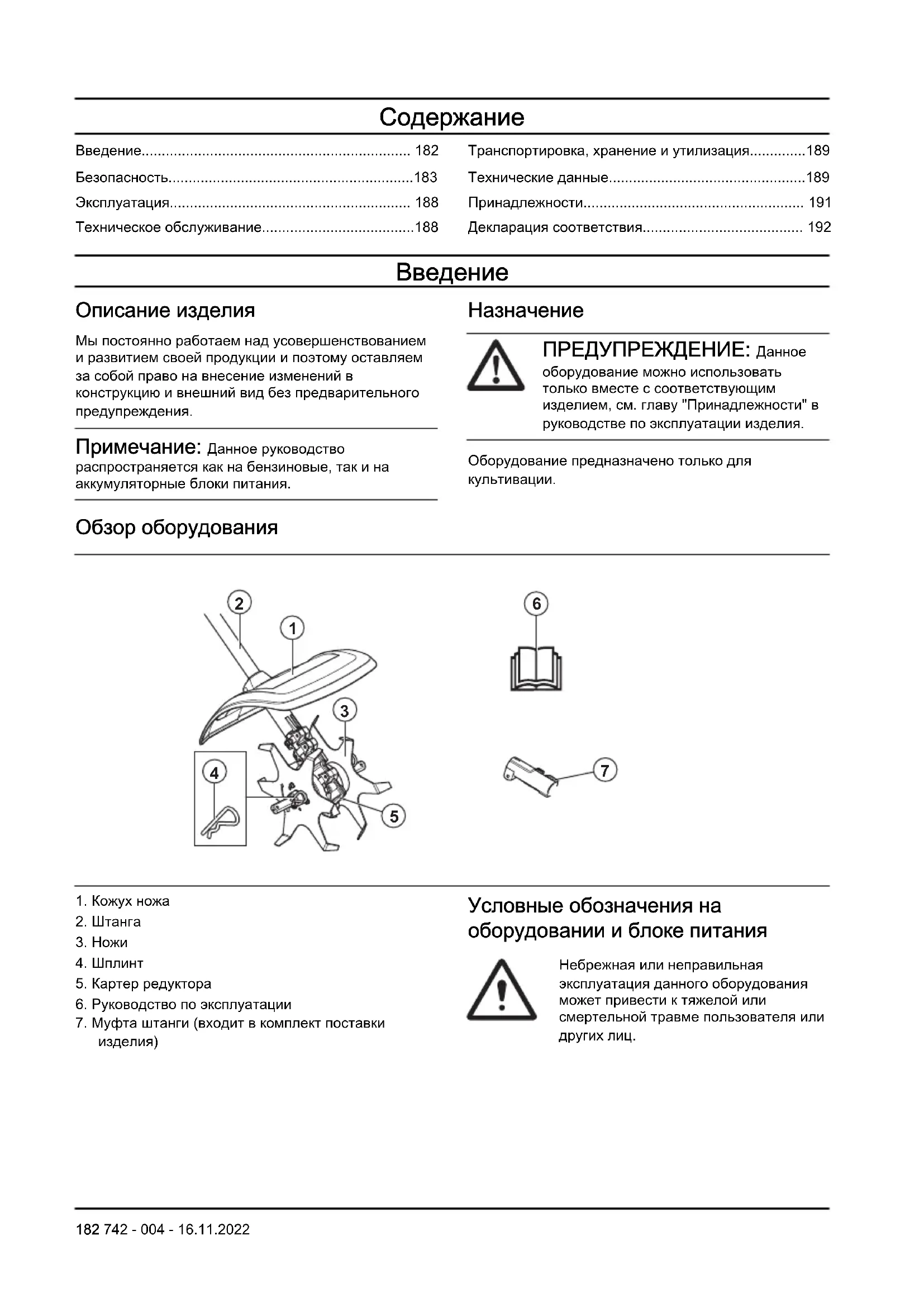 случае не пользуйтесь оборудованием с неисправными защитными приспособлениями. Техобслуживание и проверка защитных приспособлений должны выполняться так, как это описано в данном разделе. Если в результате этих проверок оборудования обнаружены неисправности, немедленно обратитесь к специалисту для выполнения ремонта. ПРЕДУПРЕЖДЕНИЕ: Для обслуживания и ремонта изделия требуется специальная подготовка. Это особенно относится к защитным приспособлениям изделия. При обнаружении одной или нескольких неисправностей (см. перечень проверок ниже) в обязательном порядке обратитесь в сервисный центр. При приобретении любой нашей продукции вы гарантированно получаете доступ к профессиональной помощи по ремонту и обслуживанию. Если изделие было приобретено у дилера, не имеющего 186 742 - 004 - 16.11.2022сервисного центра, узнайте у него адрес ближайшего сервисного центра. Проверка режущего оборудования Зубцы режущего оборудования рассчитаны на нагрузку от культивации. Два основных правила: