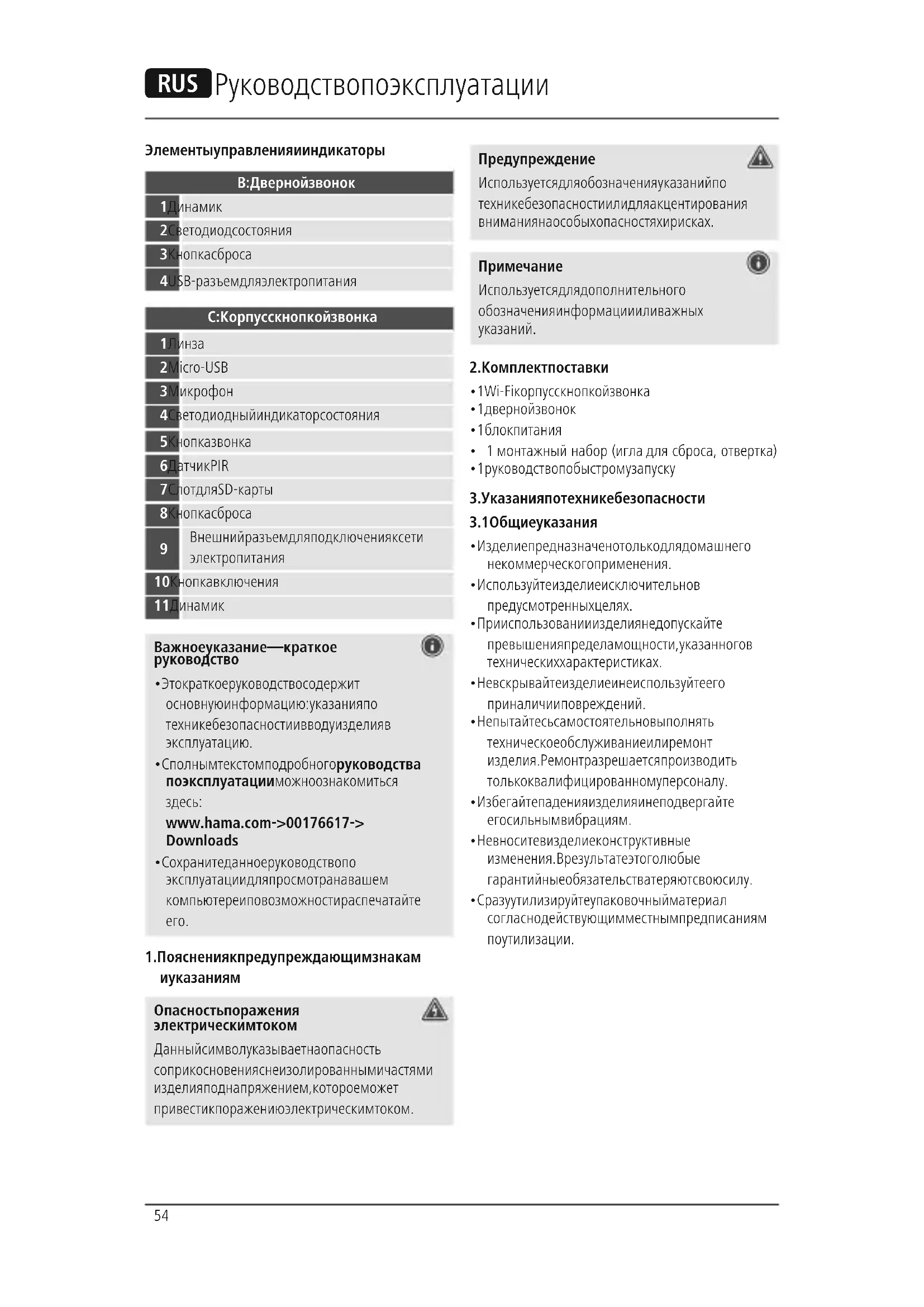 Härmed försäkrar Hama GmbH & Co KG, att denna typ av radioutrustning [00176617] överensstämmer med direktiv 2014/53/EU. Den fullständiga texten till EU-försäkran om överensstämmelse nns på följande webbadress: www.hama.com->00176617->Downloads.54 R Руководство по эксплуатации Элементы управления и индикаторы B: Дверной звонок 1 Динамик 2 Светодиод состояния 3 Кнопка сброса 4 USB-разъем для электропитания C: Корпус с кнопкой звонка 1 Линза 2 Micro-USB 3 Микрофон 4 Светодиодный индикатор состояния 5 Кнопка звонка 6 Датчик PIR 7 Слот для SD-карты 8 Кнопка сброса