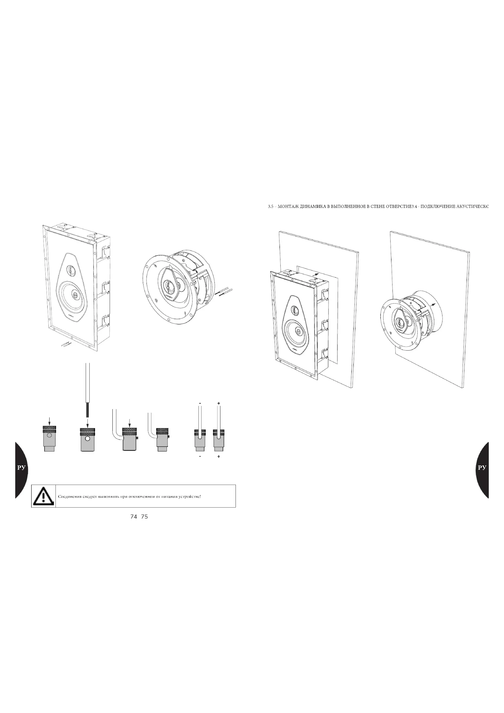 3.5 – МОНТАЖ ДИНАМИКА В ВЫПОЛНЕННОЕ В СТЕНЕ ОТВЕРСТИЕ3.4 - ПОДКЛЮЧЕНИЕ АКУСТИЧЕСКОГО КАБЕЛЯ К АКУСТИЧЕСКОЙ СИСТЕМЕ