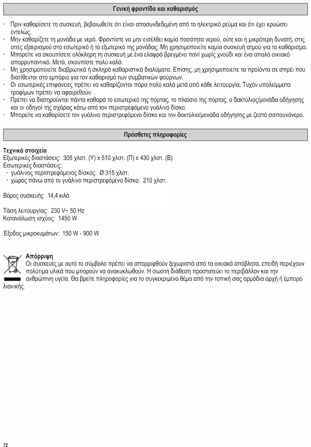 ∙ У таймера имеется две шкалы. Внешняя шкала предназначена для измерения веса размораживаемой пищи в кг. Внутренняя шкала используется для выставления времени разогревания или приготовления пищи. ∙ При помощи таймера можно установить время работы до 35 минут. ∙ При выборе времени работы менее 5 минут (или для пищи весом менее 350 г), сначала установите ручку на более высокое значение, а затем медленно поверните ее назад, чтобы установить на нужное значение. ∙ После установки таймера на нужное время печь включается автоматически при закрытии дверцы. ∙ Электроприбор можно отключить в любое время, снова установив таймер на “0”. ∙ Для размораживания пищи установите регулятор мощности в положение «Размораживание». Выставите вес размораживаемой пищи на внешней шкале таймера. Указанные значения для размораживания являются приблизительными и могут отличаться от значений, которые требуются в действительности. Если после истечения выбранного времени пища разморозилась не до конца, повторите процесс с менее продолжительной уставкой времени. Последовательность работы ∙ Положите пищу в подходящую посуду и поставьте посуду на поворотный стол в печи. ∙ При микроволновой обработке пищу следует накрыть, чтобы защитить ее от высыхания. В магазинах кухонной утвари можно купить специальные стеклянные или пластмассовые крышки, предназначенные для применения в микроволновых печах. ∙ Установите нужную мощность при помощи регулятора. ∙ Закройте дверцу и задайте время работы при помощи таймера. Поворотный стол начинает вращаться; во время работы в печи продолжает гореть лампа внутреннего освещения. ∙ При открывании дверцы во время работы (например, чтобы перемешать пищу), работа и духовки и таймера автоматически приостанавливается, но возобновляется автоматически после закрытия дверцы. ∙ После истечения заданного времени раздается звуковой сигнал и лампа внутреннего освещения гаснет. Лампа также гаснет при открывании дверцы. ∙ Откройте дверцу и выньте посуду с пищей. ∙ Оставьте посуду с пищей на несколько минут для равномерного распределения тепла по всему объему пищи.79 142 x 208 mm Общий уход и чистка ∙ Прежде чем приступить к чистке данного электроприбора, убедитесь, что он отключен от сети и полностью остыл. ∙ Не мойте электроприбор. Следите за тем, чтобы в вентиляционные отверстия на наружной поверхности или на внутреннюю поверхность электроприбора не попало даже самое малое количество воды. Не используйте для чистки электроприбора парочистки. ∙ Корпус электроприбора можно протереть влажной безворсовой тканью с применением мягкого моющего средства. После этого его нужно тщательно вытереть насухо. ∙ Не следует применять абразивные или сильнодействующие моющие средства. Аэрозоли, которые продаются для очистки духовок обычного типа, также не годятся. ∙ Тщательно очищайте внутреннюю поверхность электроприбора после каждого цикла работы. Удаляйте из печи все остатки пищи. ∙ Всегда содержите в чистоте внутреннюю поверхность дверцы, раму дверцы, роликовое кольцо с приводом и зону направляющей дорожки под стеклянным поворотным столом. ∙ Стеклянный поворотный стол и роликовое кольцо с приводом можно мыть в теплой мыльной воде. Дополнительная информация Технические данные Габариты: 305 мм (В) 510 мм (Ш) 430 мм (Г) Внутренние разме