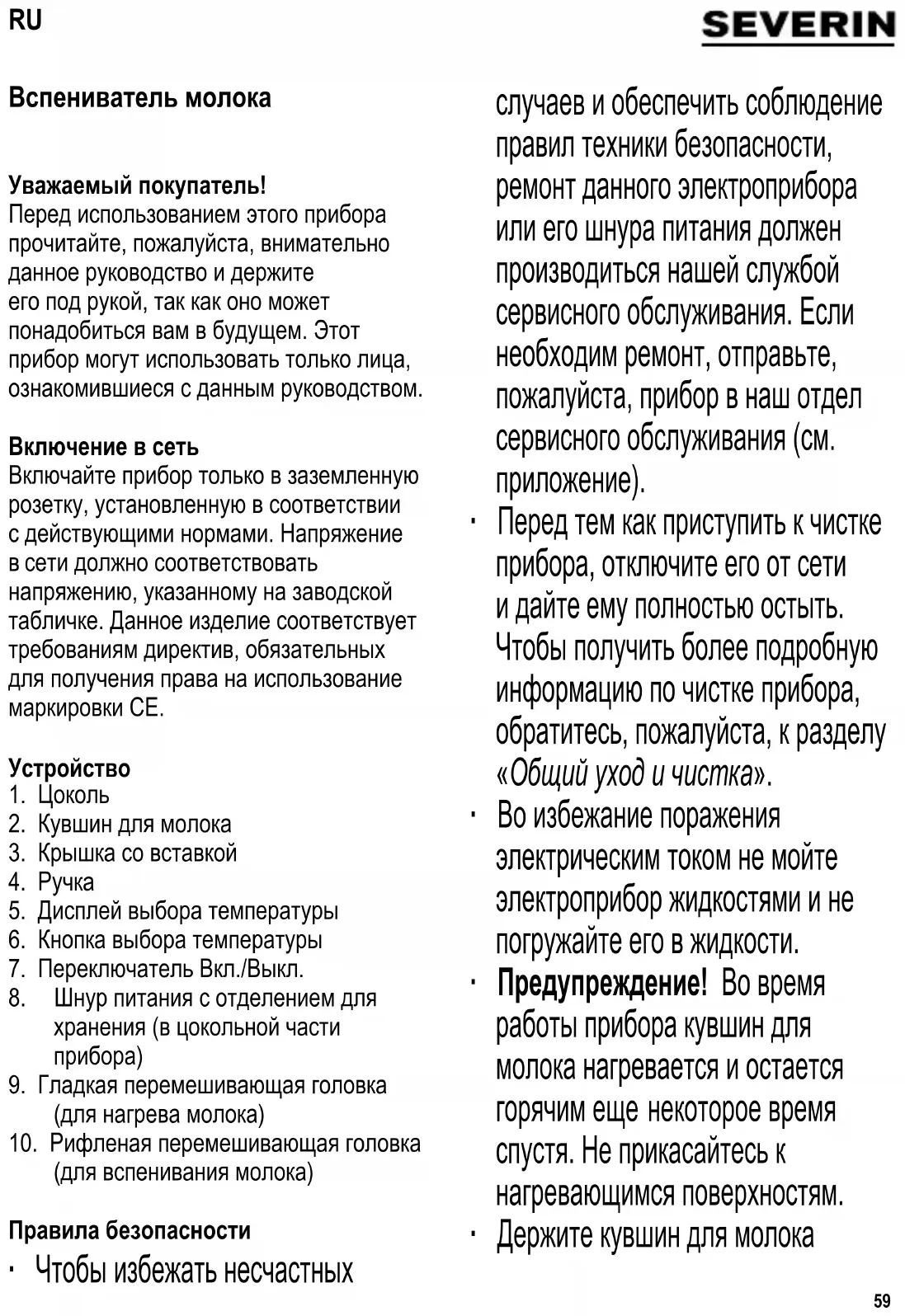 ∙ Предупреждение! Держите упаковочные материалы в недоступном для детей месте, так как они представляют опасность удушья. ∙ Перед каждым включением электроприбора следует убедиться в отсутствии повреждений как на основном устройстве, включая и шнур питания, так и на любом дополнительном, если оно установлено. Если вы роняли прибор на твердую поверхность или прилагали чрезмерное усилие для вытягивания шнура питания, этот прибор не следует больше использовать: даже невидимое повреждение может отрицательно сказаться на эксплуатационной безопасности прибора. ∙ Этот прибор предназначен только для нагрева и вспенивания молока. Не наливайте в кувшин никакую другую61 жидкость и не кладите в него твердую
