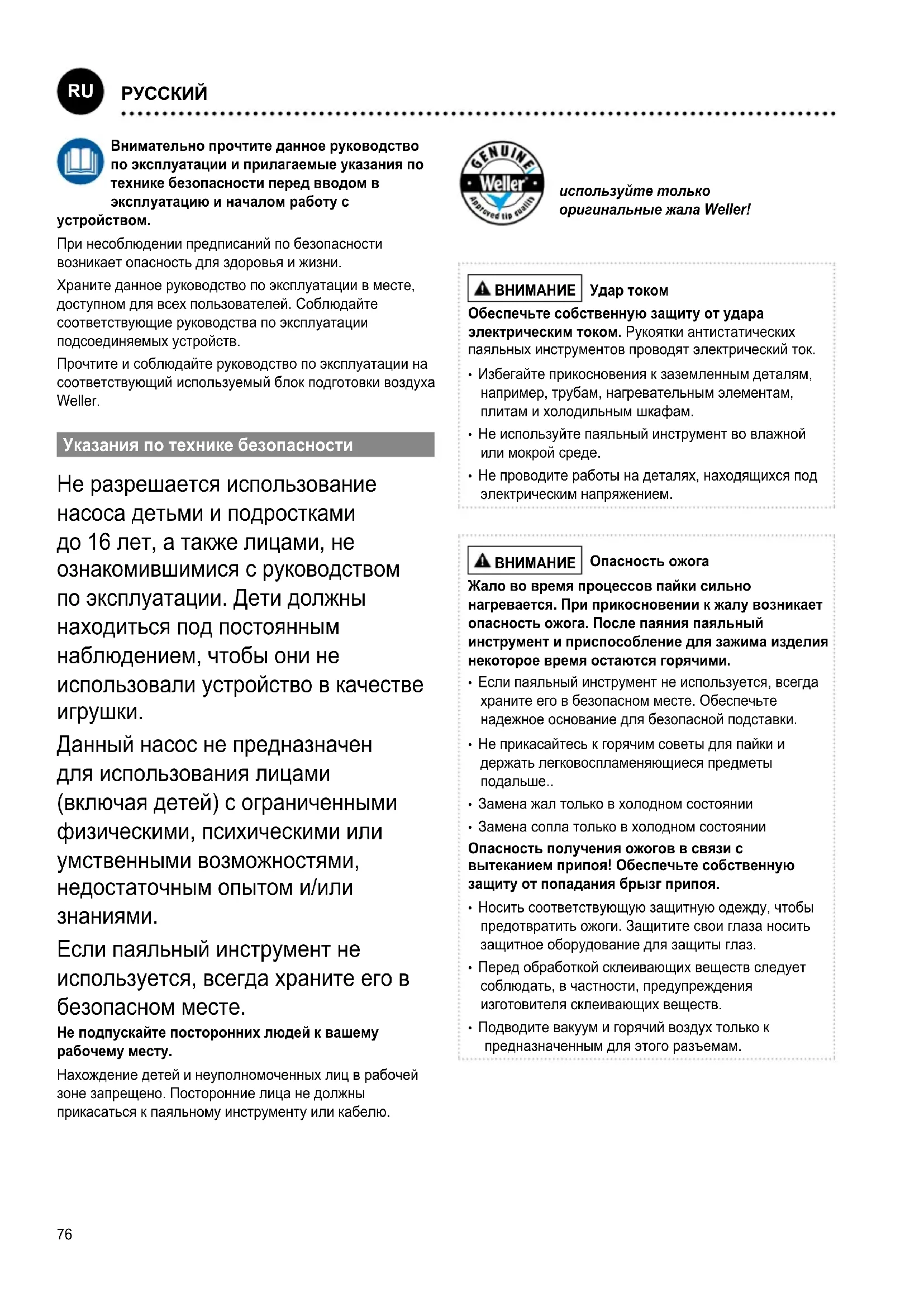 Если паяльный инструмент не используется, всегда храните его в безопасном месте. Не подпускайте посторонних людей к вашему рабочему месту. Нахождение детей и неуполномоченных лиц в рабочей зоне запрещено. Посторонние лица не должны прикасаться к паяльному инструменту или кабелю. используйте только оригинальные жала Weller!