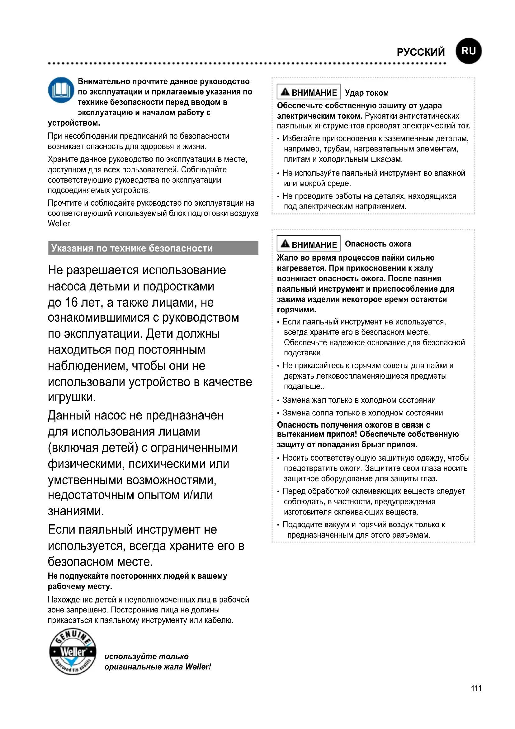 HRVATSKI111 Внимательно прочтите данное руководство по эксплуатации и прилагаемые указания по технике безопасности перед вводом в эксплуатацию и началом работу с устройством. При несоблюдении предписаний по безопасности возникает опасность для здоровья и жизни. Храните данное руководство по эксплуатации в месте, доступном для всех пользователей. Соблюдайте соответствующие руководства по эксплуатации подсоединяемых устройств. Прочтите и соблюдайте руководство по эксплуатации на соответствующий используемый блок подготовки воздуха Weller. Указания по технике безопасности Не разрешается использование насоса детьми и подростками до 16 лет, а также лицами, не ознакомившимися с руководством по эксплуатации. Дети должны находиться под постоянным наблюдением, чтобы они не использовали устройство в качестве