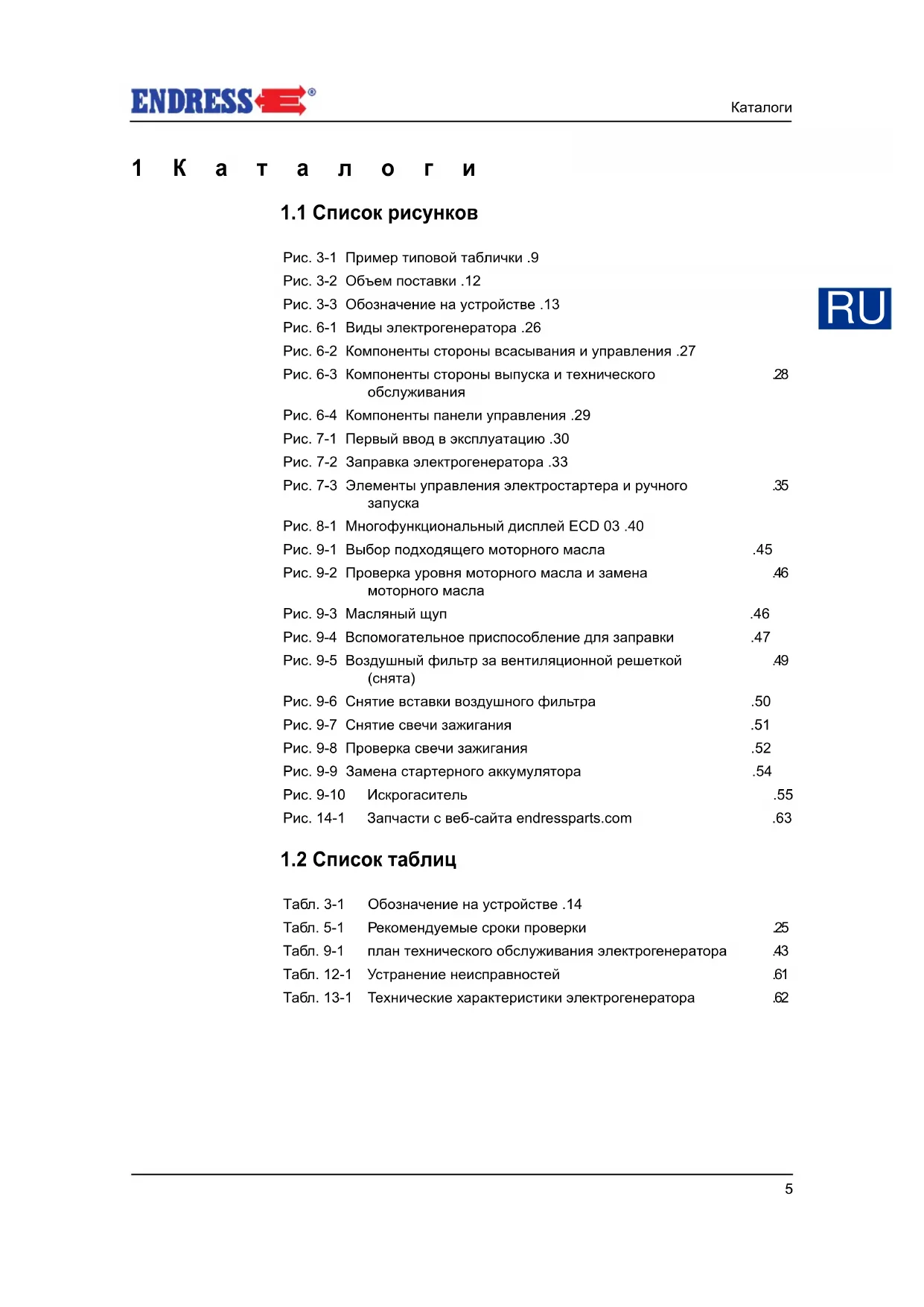 Рис. 9-6 Снятие вставки воздушного фильтра .50 Рис. 9-7 Снятие свечи зажигания .51 Рис. 9-8 Проверка свечи зажигания .52 Рис. 9-9 Замена стартерного аккумулятора .54 Рис. 9-10 Искрогаситель .55 Рис. 14-1 Запчасти с веб-сайта endressparts.com .63 Табл. 3-1 Обозначение на устройстве .14 Табл. 5-1 Рекомендуемые сроки проверки .25 Табл. 9-1 план технического обслуживания электрогенератора .43 Табл. 12-1 Устранение неисправностей .61 Табл. 13-1 Технические характеристики электрогенератора .62 RU6 О данном Руководстве 2 О данном Руководстве Цель этого руководства по эксплуатации – наилучшим образом описать и пояснить ваш электрогенератор и его использование. При этом мы ориентируемся на новый европейский стандарт DIN EN 82079- 1 по составлению руководств по эксплуатации. УВЕДОМЛЕНИЕ! Для безопасного применения по назначению необходимо внимательно прочесть и понять данное руководство по эксплуатации перед первым использованием прибора. Соблюдение указаний необходимо, чтобы