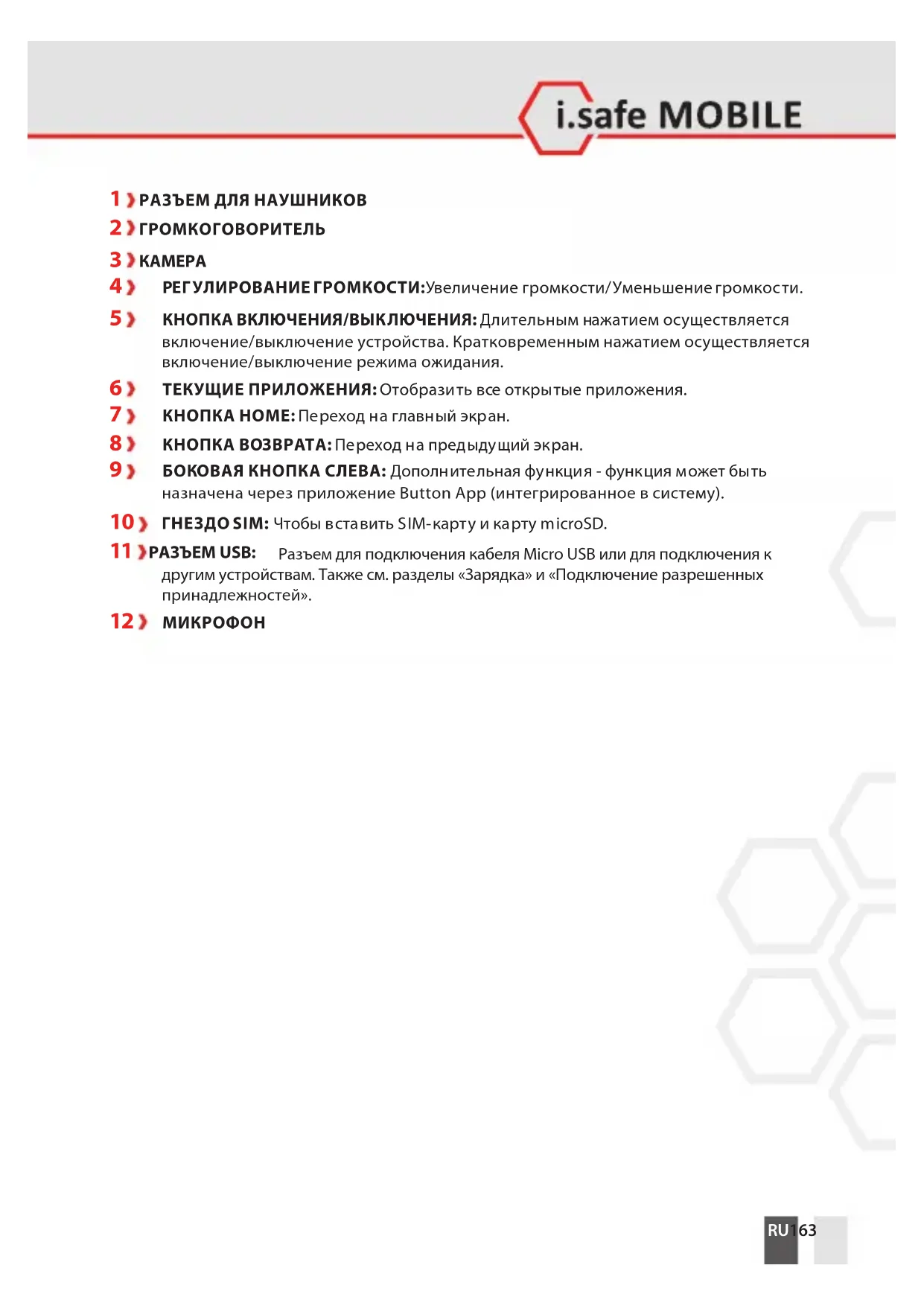 Микрофон расположен на нижней части устройства. Для оптимальной связи следите за тем, чтобы микрофон не был закрыт.RU 169 ПОДКЛЮЧЕНИЕ РАЗРЕШЕННЫХ ПРИНАДЛЕЖНОСТЕЙ Допускается подключение к устройству только принадлежностей, разрешенных к применению компанией i.safe MOBILE. Перечень принадлежностей, разрешенных к применению компанией i.safe MOBILE, можно найти по ссылке www.isafe-mobile.com/en/products Вы можете подключить одобренные принадлежности к разъему USB. РАЗЪЕМ USB