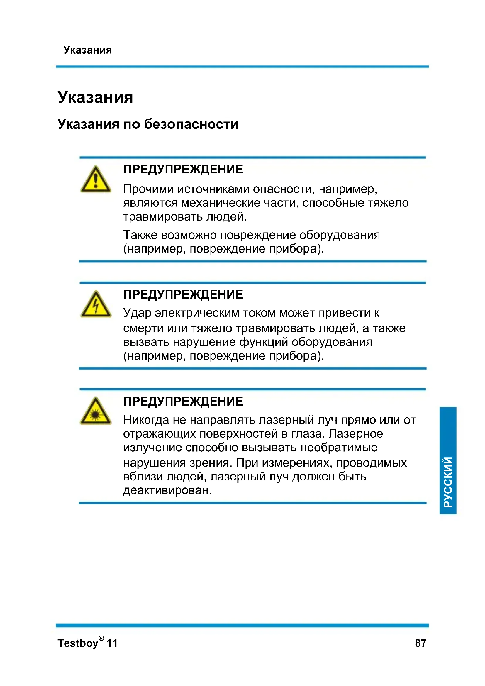 Изготовитель не несет ответственность за материальный ущерб или вред здоровью людей, возникающий вследствие неправильного обращения с прибором или несоблюдения правил техники безопасности. В таких случаях исключаются всякие гарантийные претензии. В настоящей Инструкции по эксплуатации указания по технике безопасности сопровождаются восклицательным знаком в треугольнике. Перед вводом прибора в эксплуатацию полностью прочитать Инструкцию. Данный прибор имеет знак CE, то есть отвечает требованиям необходимых директив. Сохраняется право на изменение спецификаций без предварительного уведомления. © Testboy GmbH, ГерманияУказания Testboy