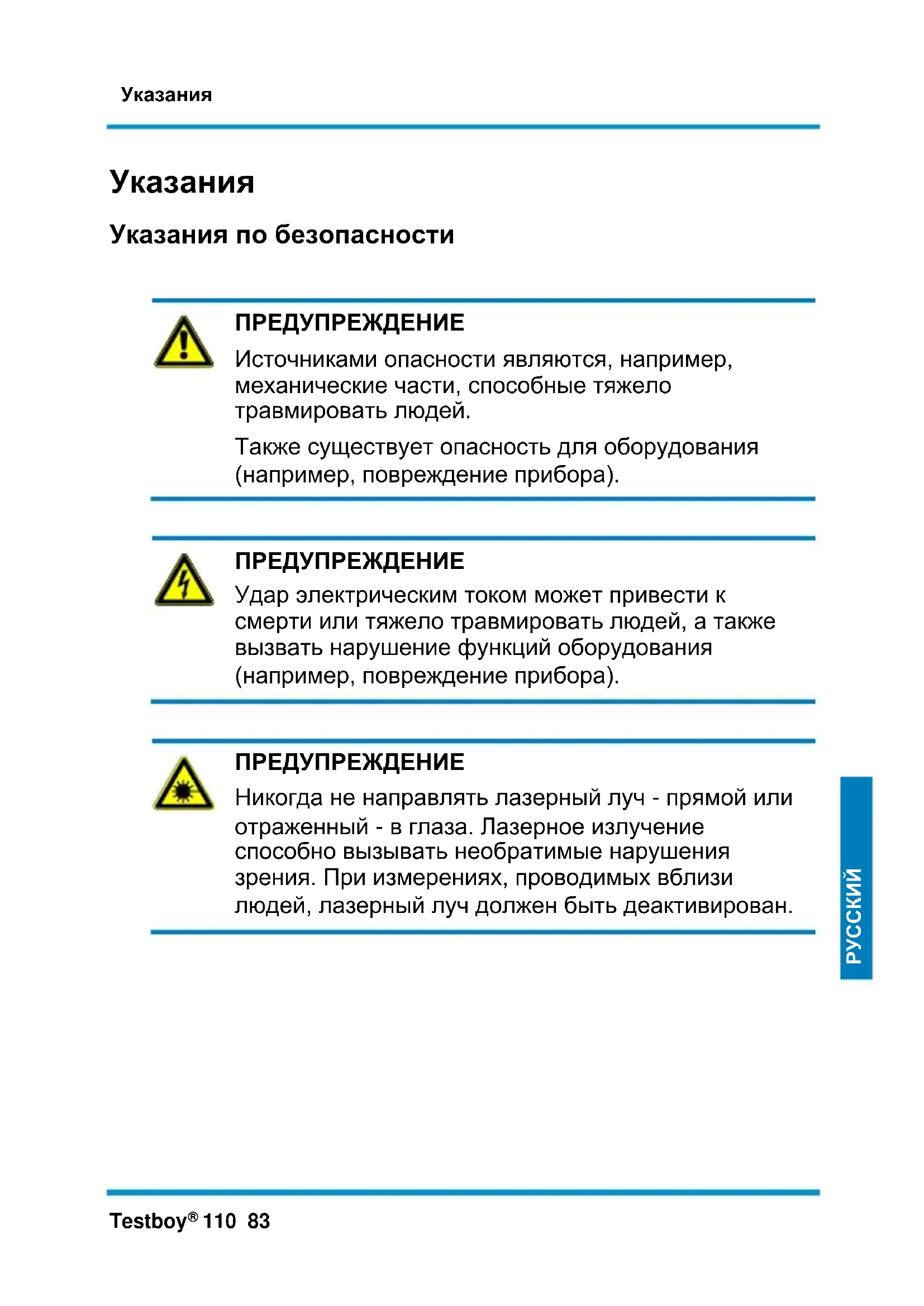 ПРЕДУПРЕЖДЕНИЕ Никогда не направлять лазерный луч - прямой или отраженный - в глаза. Лазерное излучение способно вызывать необратимые нарушения зрения. При измерениях, проводимых вблизи людей, лазерный луч должен быть деактивирован.Указания 84 Testboy