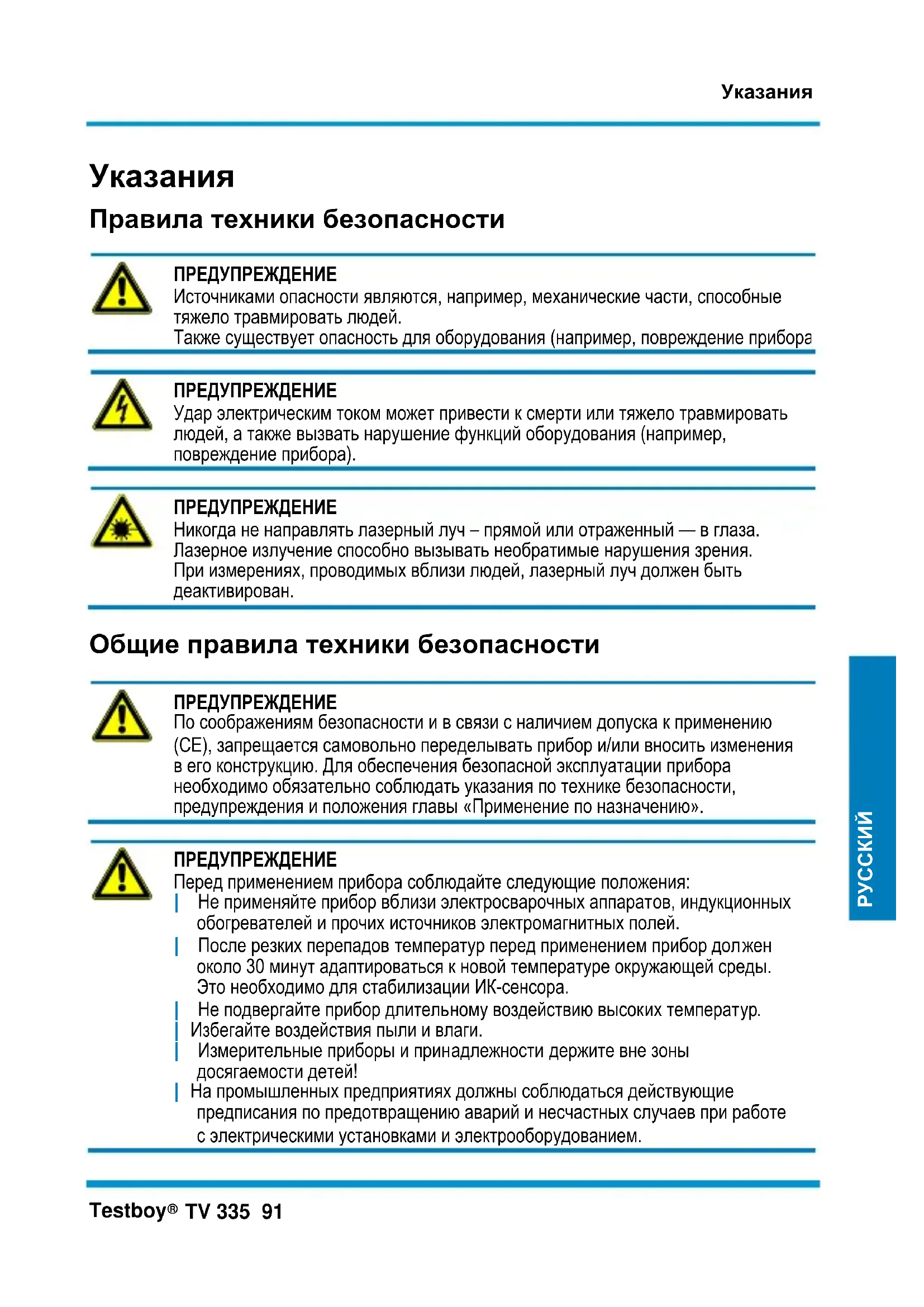 ПРЕДУПРЕЖДЕНИЕ Перед применением прибора соблюдайте следующие положения: | Не применяйте прибор вблизи электросварочных аппаратов, индукционных обогревателей и прочих источников электромагнитных полей. | После резких перепадов температур перед применением прибор должен около 30 минут адаптироваться к новой температуре окружающей среды. Это необходимо для стабилизации ИК-сенсора. | Не подвергайте прибор длительному воздействию высоких температур. | Избегайте воздействия пыли и влаги. | Измерительные приборы и принадлежности держите вне зоны досягаемости детей! | На промышленных предприятиях должны соблюдаться действующие предписания по предотвращению аварий и несчастных случаев при работе с электрическими установками и электрооборудованием.Указания