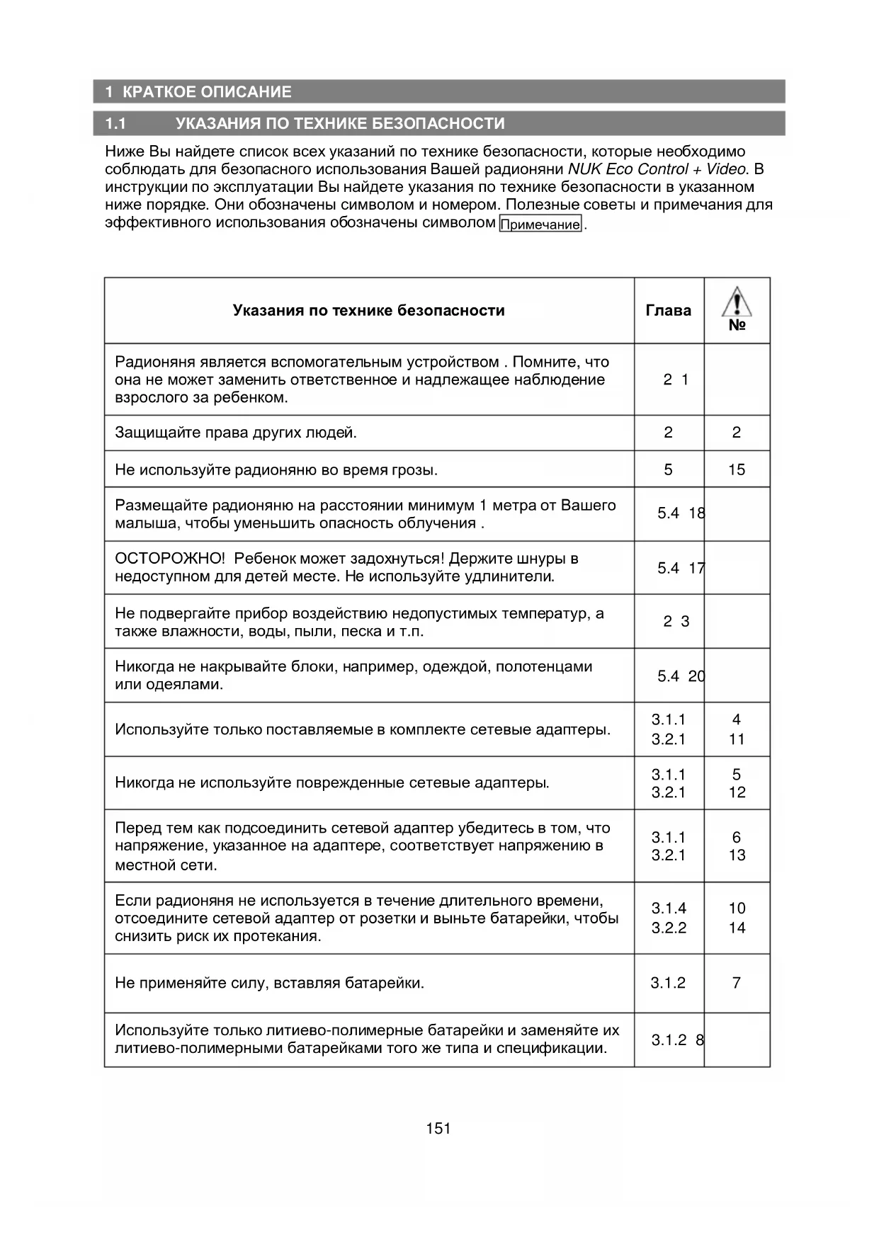 Ниже Вы найдете список всех указаний по технике безопасности, которые необходимо соблюдать для безопасного использования Вашей радионяни NUK Eco Control + Video. В инструкции по эксплуатации Вы найдете указания по технике безопасности в указанном ниже порядке. Они обозначены символом и номером. Полезные советы и примечания для эффективного использования обозначены символом Примечание .