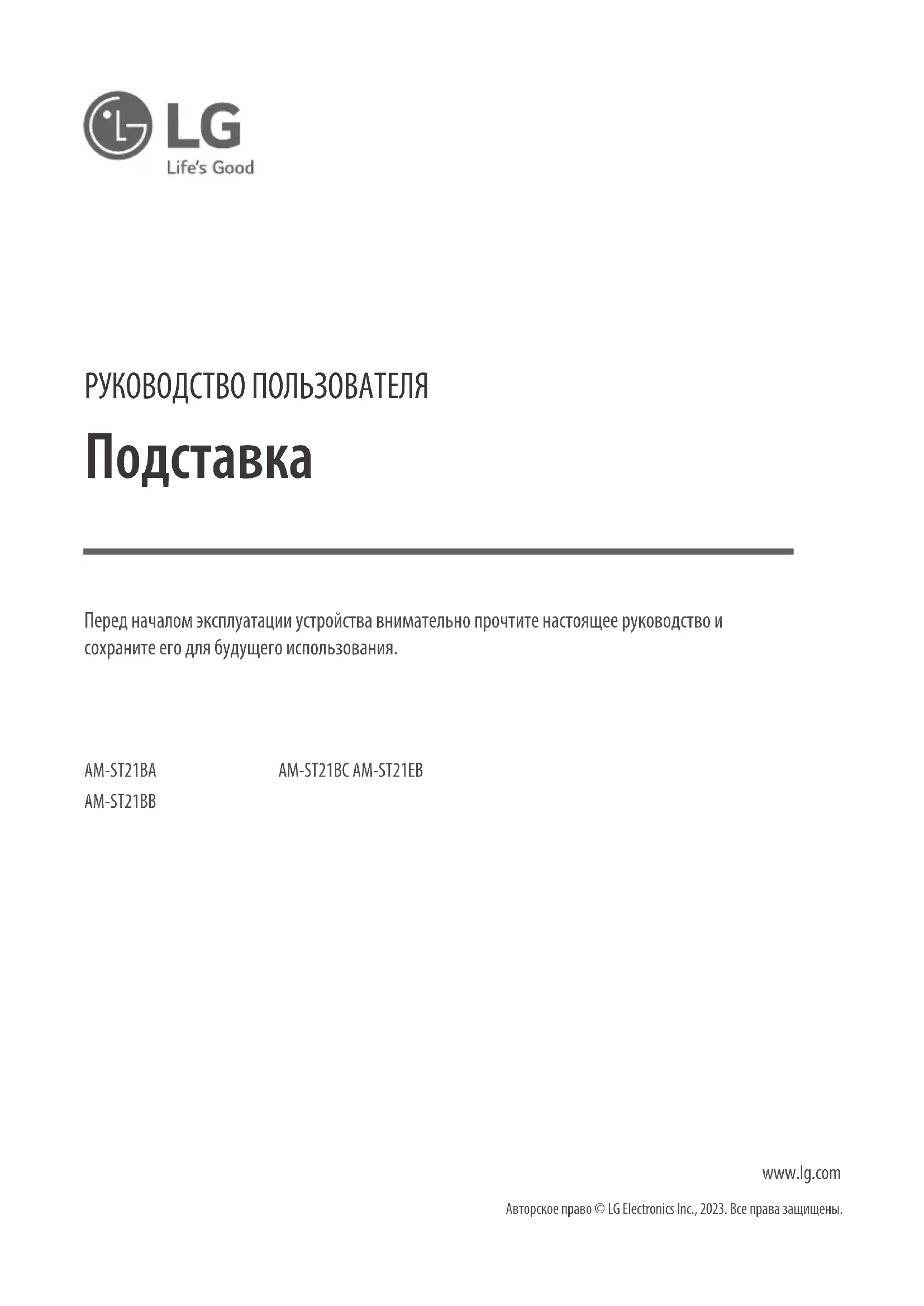 www.lg.com Авторское право © LG Electronics Inc., 2023. Все права защищены. Перед началом эксплуатации устройства внимательно прочтите настоящее руководство и сохраните его для будущего использования. AM-ST21BA AM-ST21BB AM-ST21BC AM-ST21EB2