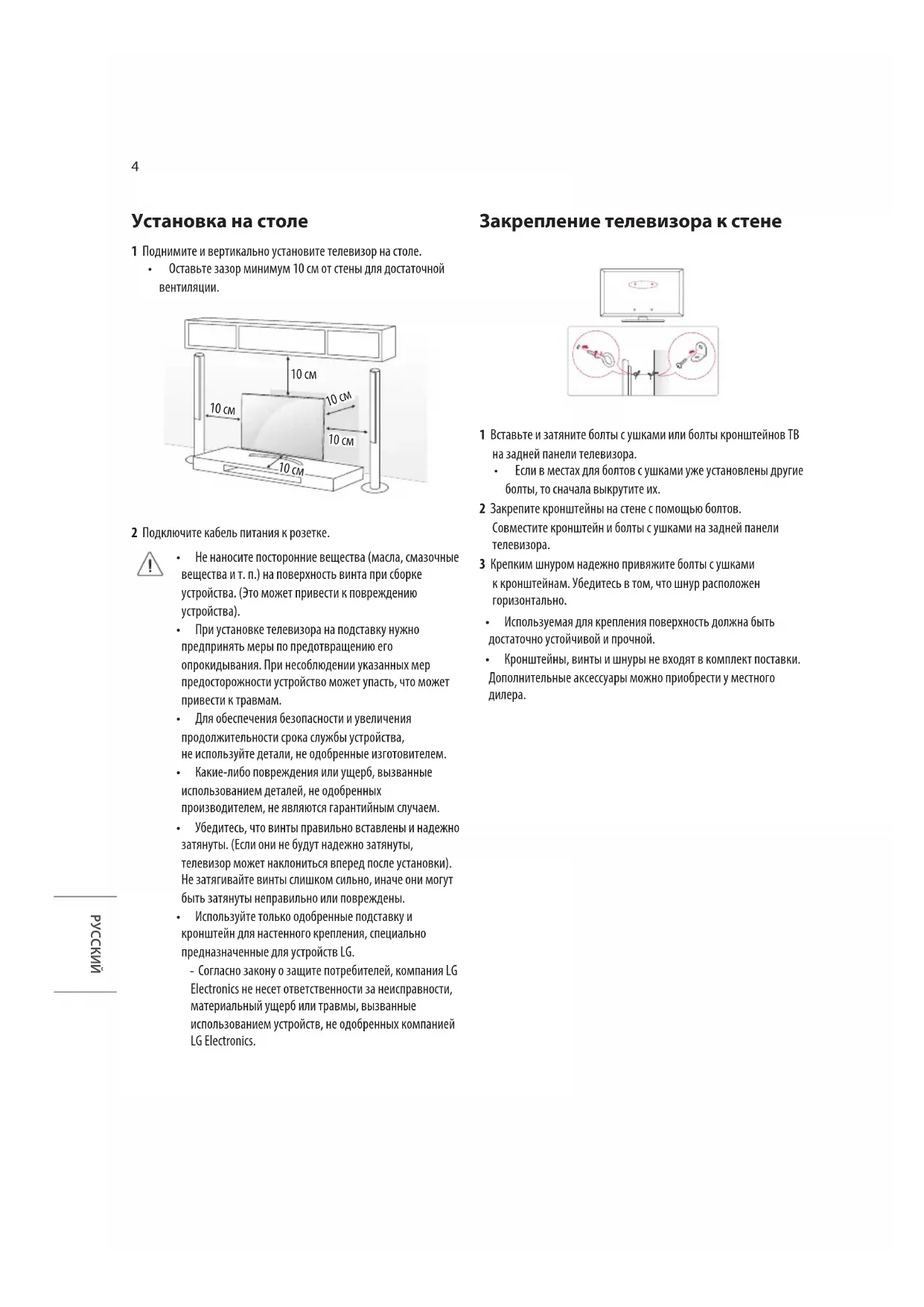 - Используйте только одобренные подставку и кронштейн для настенного крепления, специально предназначенные для устройств LG. - Согласно закону о защите потребителей, компания LG Electronics не несет ответственности за неисправности, материальный ущерб или травмы, вызванные использованием устройств, не одобренных компанией LG Electronics. Закрепление телевизора к стене 1 Вставьте и затяните болты с ушками или болты кронштейнов ТВ на задней панели телевизора.