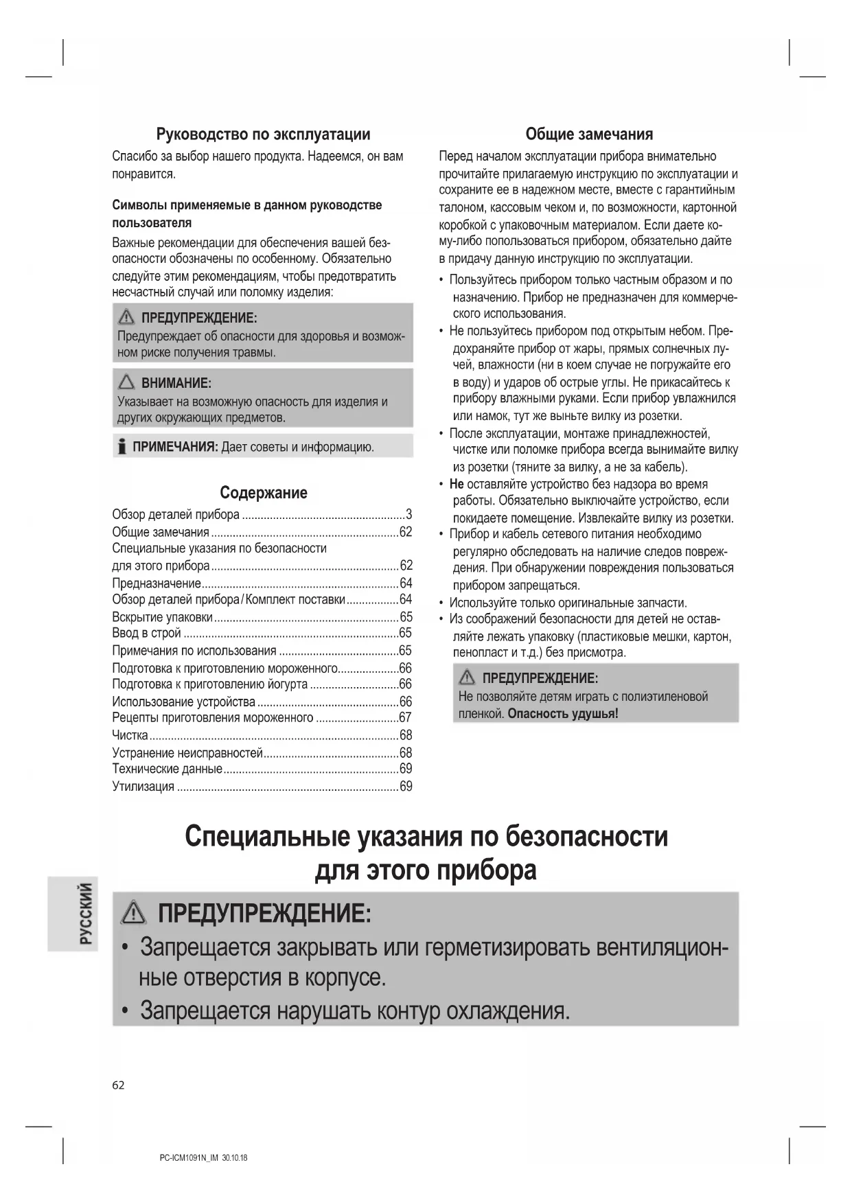 - Не отремонтировать устройство самостоятельно. Всегда обращайтесь к квалифицированному техническому специ- алисту. Если провод питания поврежден, во избежание опасности замену должен производить изготовитель прибора,PC-ICM1091N_IM 30.10.18