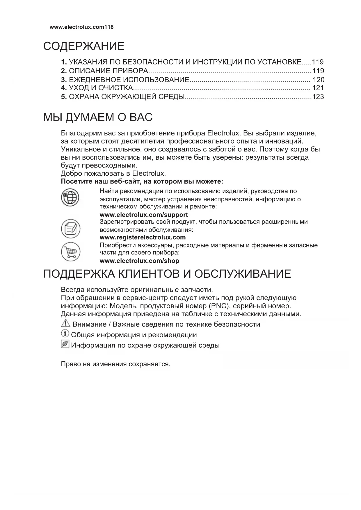 МЫ ДУМАЕМ О ВАС Благодарим вас за приобретение прибора Electrolux. Вы выбрали изделие, за которым стоят десятилетия профессионального опыта и инноваций. Уникальное и стильное, оно создавалось с заботой о вас. Поэтому когда бы вы ни воспользовались им, вы можете быть уверены: результаты всегда будут превосходными. Добро пожаловать в Electrolux. Посетите наш веб-сайт, на котором вы можете: Найти рекомендации по использованию изделий, руководства по эксплуатации, мастер устранения неисправностей, информацию о техническом обслуживании и ремонте: www.electrolux.com/support Зарегистрировать свой продукт, чтобы пользоваться расширенными возможностями обслуживания: www.registerelectrolux.com Приобрести аксессуары, расходные материалы и фирменные запасные части для своего прибора: www.electrolux.com/shop ПОДДЕРЖКА КЛИЕНТОВ И ОБСЛУЖИВАНИЕ Всегда используйте оригинальные запчасти. При обращении в сервис-центр следует иметь под рукой следующую информацию: Модель, продуктовый номер (PNC), серийный номер. Данная информация приведена на табличке с техническими данными. Внимание / Важные сведения по технике безопасности Общая информация и рекомендации Информация по охране окружающей среды Право на изменения сохраняется. www.electrolux.com1181. УКАЗАНИЯ ПО БЕЗОПАСНОСТИ И ИНСТРУКЦИИ ПО УСТАНОВКЕ