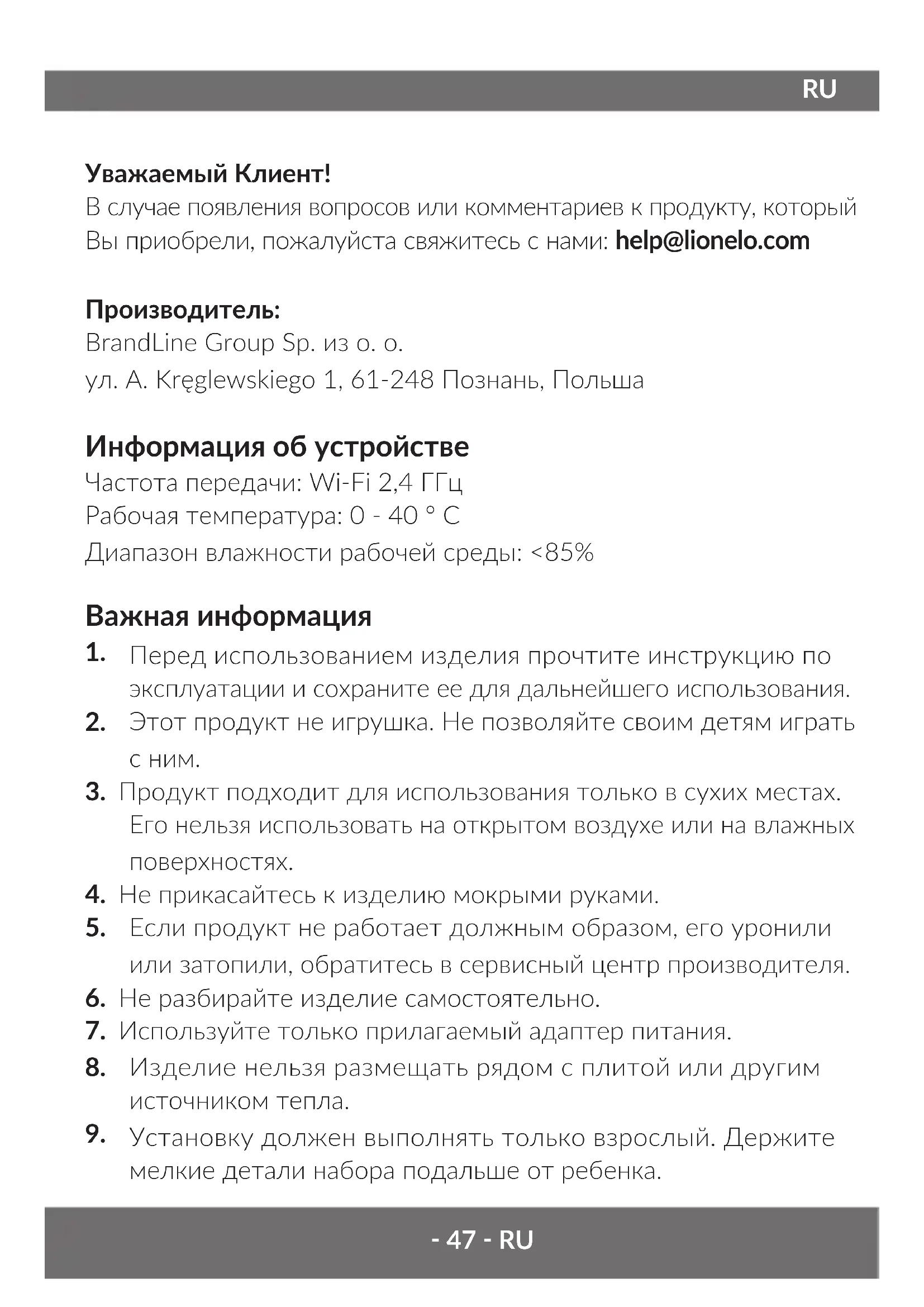 Уважаемый Клиент! В случае появления вопросов или комментариев к продукту, который Вы приобрели, пожалуйста свяжитесь с нами: help@lionelo.com Производитель: BrandLine Group Sp. из о. о. ул. A. Kręglewskiego 1, 61-248 Познань, Польша Информация об устройстве Частота передачи: Wi-Fi 2,4 ГГц Рабочая температура: 0 - 40 ° C Диапазон влажности рабочей среды: <85% Важная информация