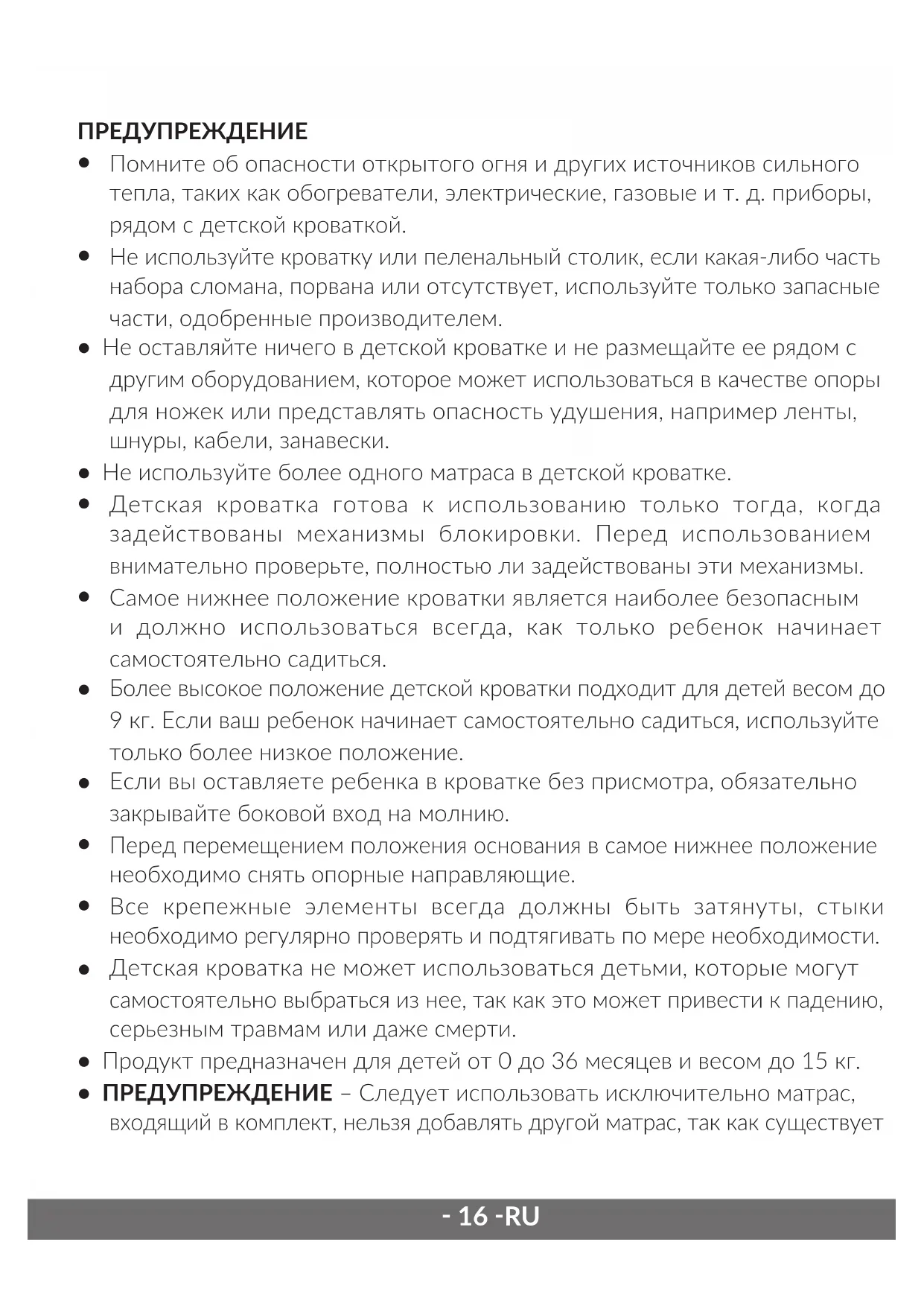 - ПРЕДУПРЕЖДЕНИЕ – Следует использовать исключительно матрас, входящий в комплект, нельзя добавлять другой матрас, так как существует‑ 17 ‑ RU риск удушения.