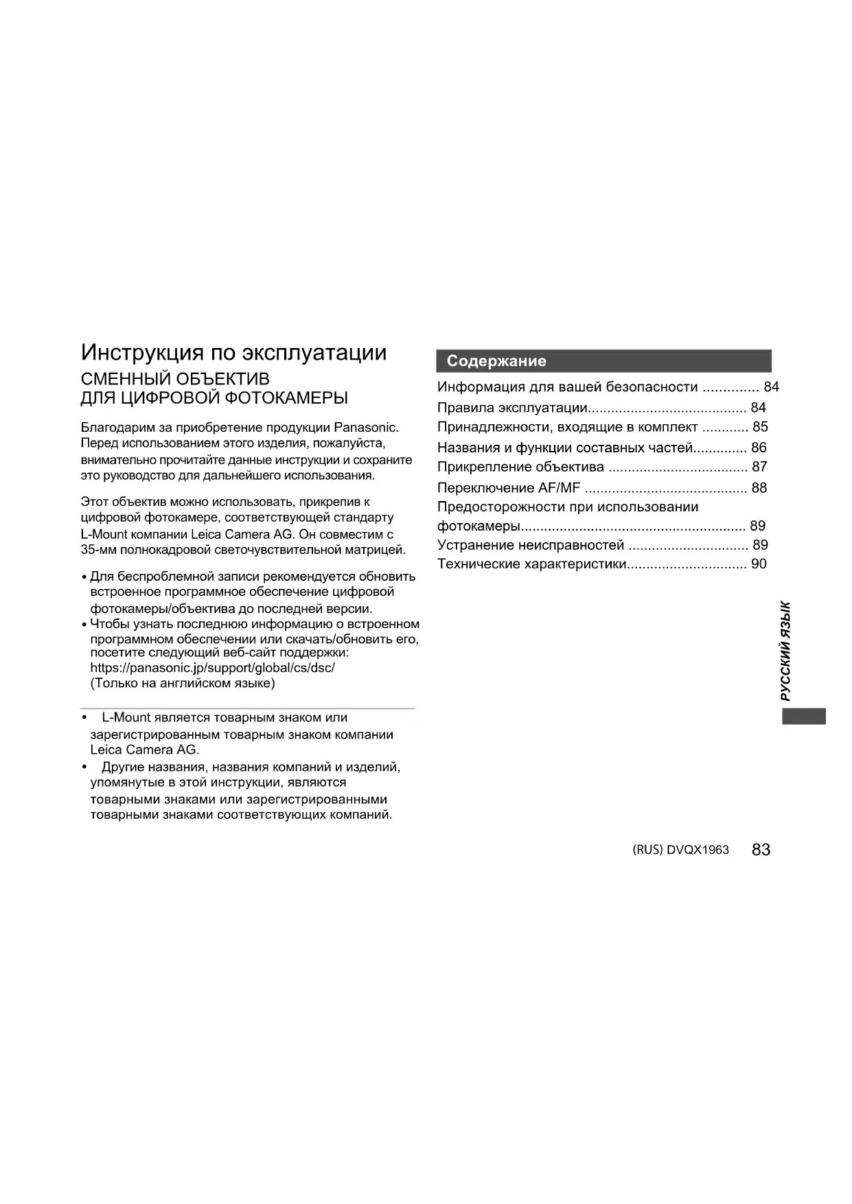 - S-E2470-DVQX1963.book 82 ページ 2019年7月30日 火曜日 午前10時45分83 (RUS) DVQX1963 РУССКИЙ ЯЗЫК Инструкция по эксплуатации СМЕННЫЙ ОБЪЕКТИВ ДЛЯ ЦИФРОВОЙ ФОТОКАМЕРЫ Благодарим за приобретение продукции Panasonic.Перед использованием этого изделия, пожалуйста, внимательно прочитайте данные инструкции и сохраните это руководство для дальнейшего использования.Этот объектив можно использовать, прикрепив к цифровой фотокамере, соответствующей стандарту L-Mount компании Leica Camera AG. Он совместим с 35-мм полнокадровой светочувствительной матрицей. Для беспроблемной записи рекомендуется обновить встроенное программное обеспечение цифровой фотокамеры/объектива до последней версии. Чтобы узнать последнюю информацию о встроенном программном обеспечении или скачать/обновить его, посетите следующий веб-сайт поддержки:https://panasonic.jp/support/global/cs/dsc/(Только на английском языке) 0 L-Mount является товарным знаком или зарегистрированным товарным знаком компании Leica Camera AG. 0 Другие названия, названия компаний и изделий, упомянутые в этой инструкции, являются товарными знаками или зарегистрированными товарными знаками соответствующих компаний. Информация для вашей безопасности p. 84